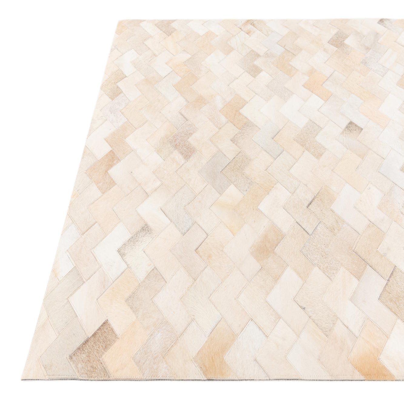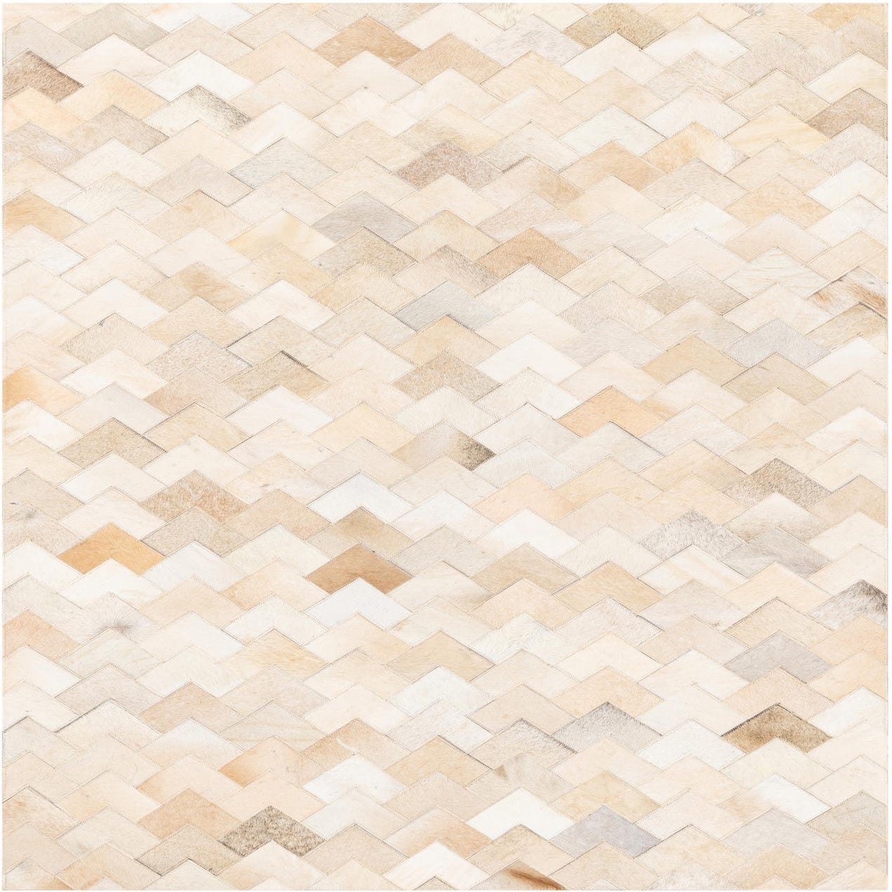 A rectangular 4x6 ivory and cream cowhide rug with a modern chevron pattern, perfect for a living room.