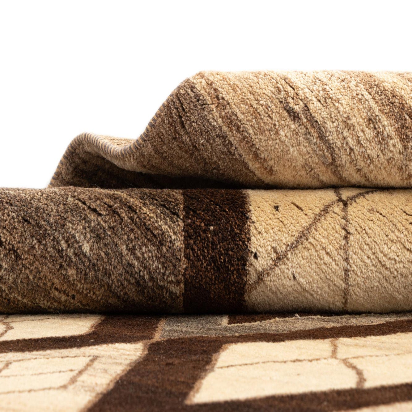 The subtle striations in the beige sections emulate the organic variations found in natural landscapes, making this rug an ideal choice for interiors seeking a touch of nature-inspired aesthetics. The plush wool pile offers a tactile experience that speaks of understated luxury without overwhelming the senses.