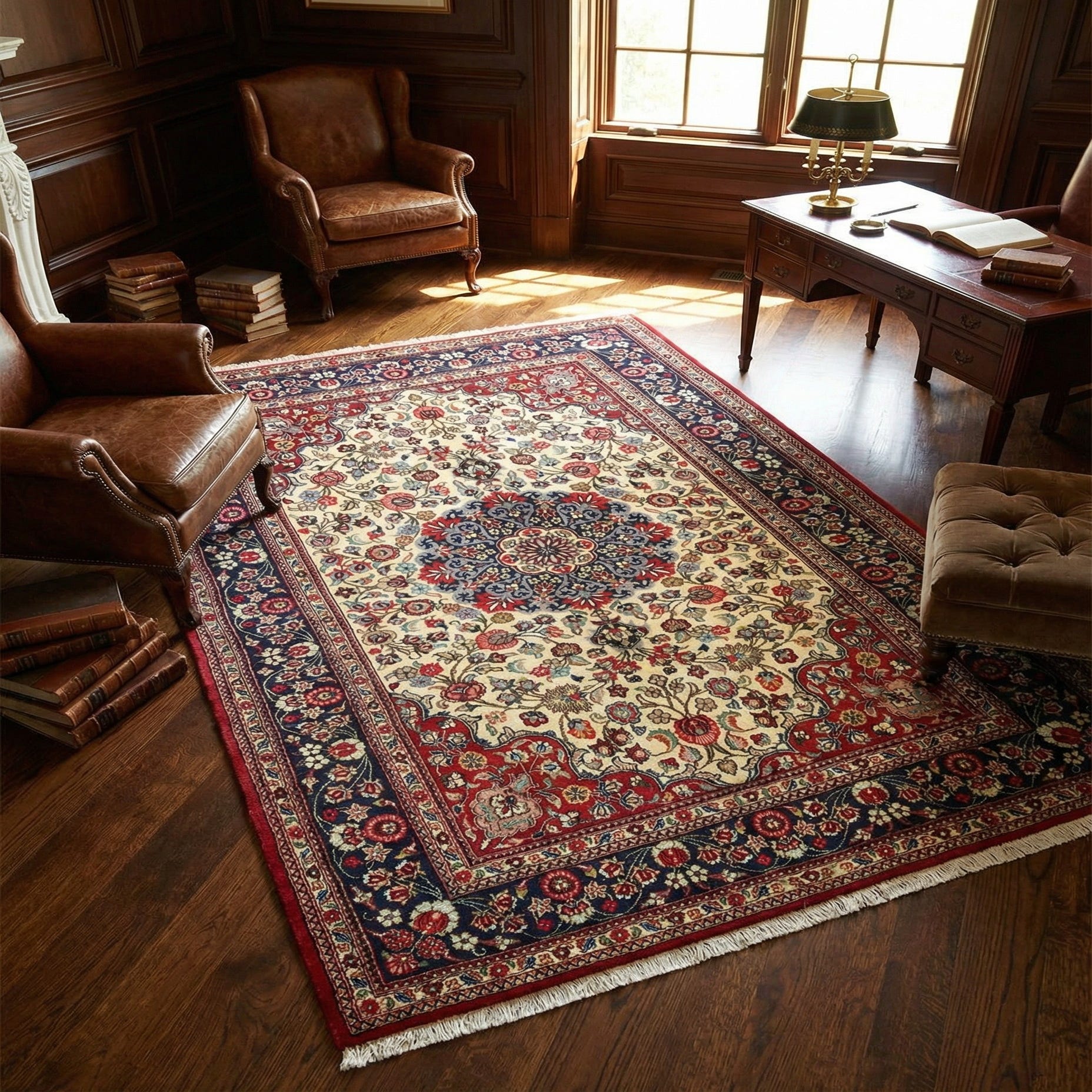 The Ghom Collection offers a hand-made wool rug with a cream background, infused with a rich palette including reds, navies, and accents of greens, blues, and touches of gold. This 4x6 rug features a detailed central medallion surrounded by intricate floral motifs, which are replicated in the border, creating a cohesive traditional design. The plush wool construction ensures a soft, comfortable texture underfoot.