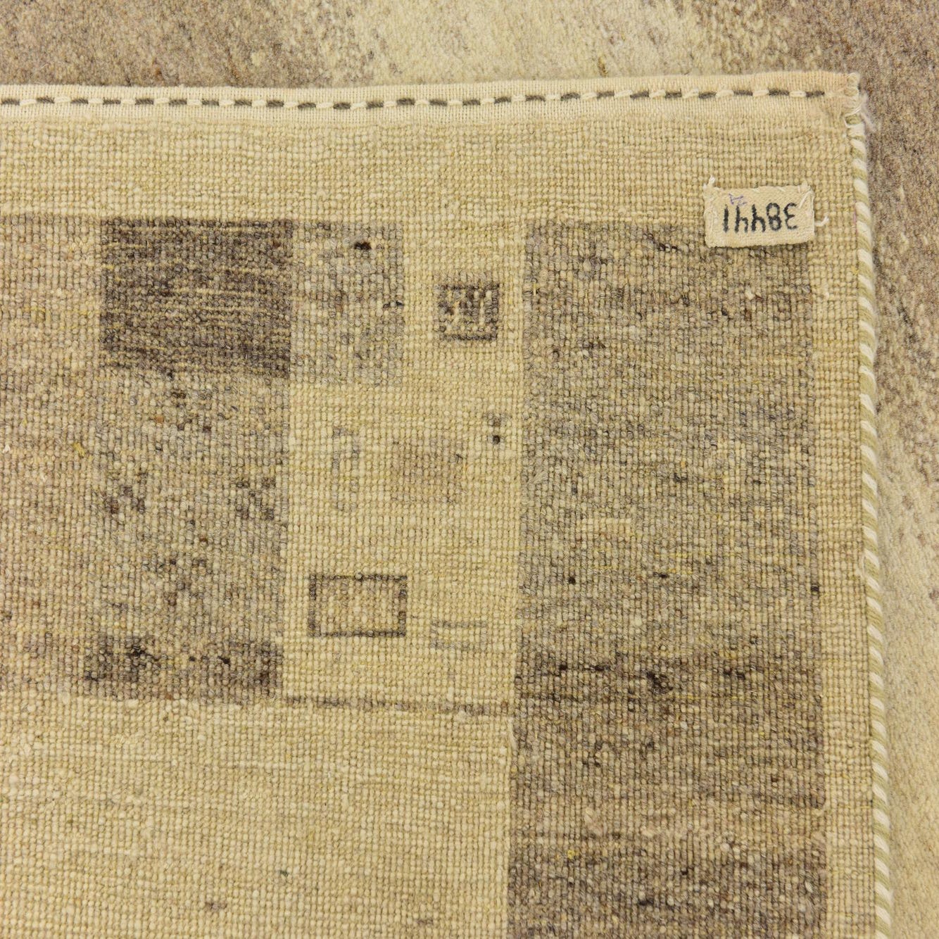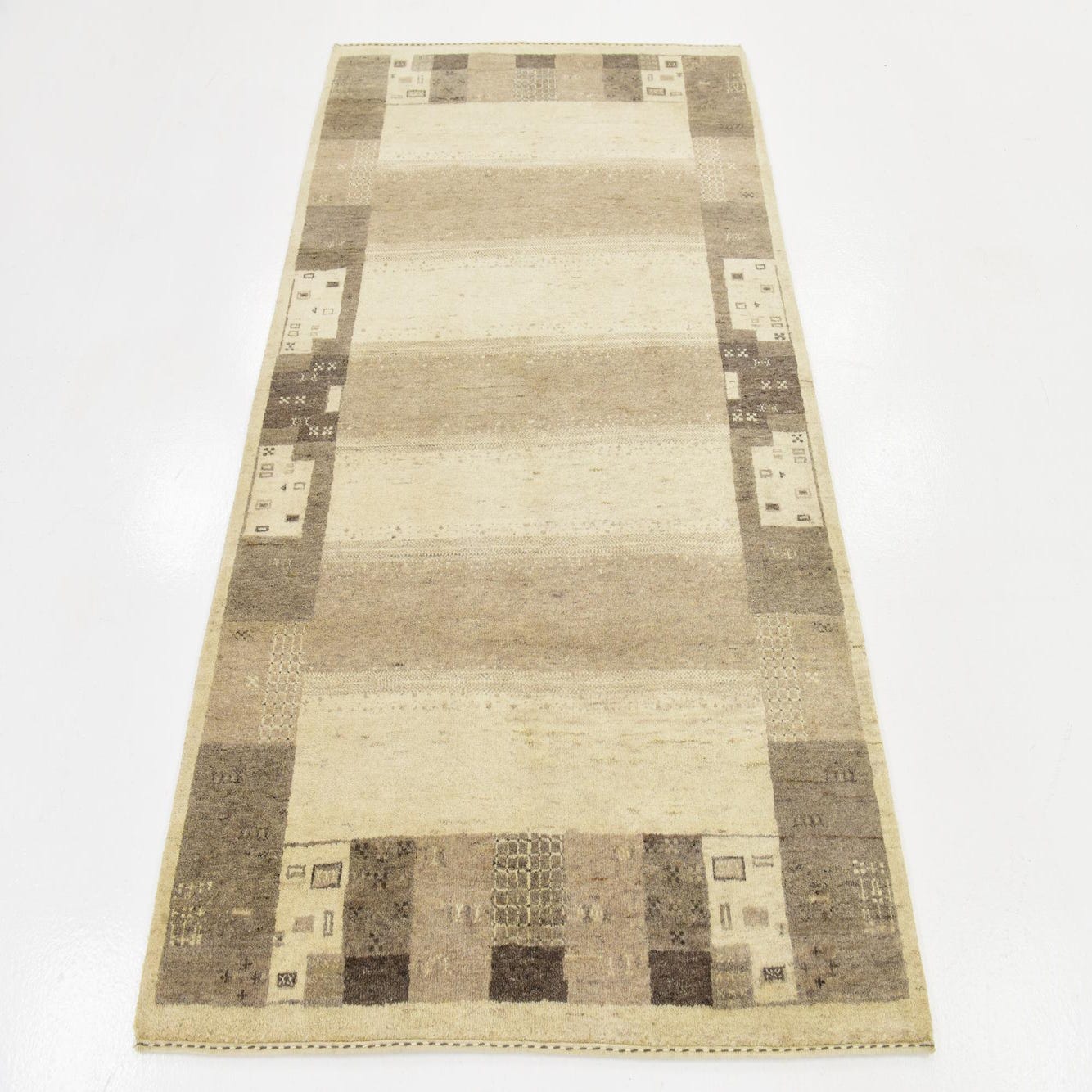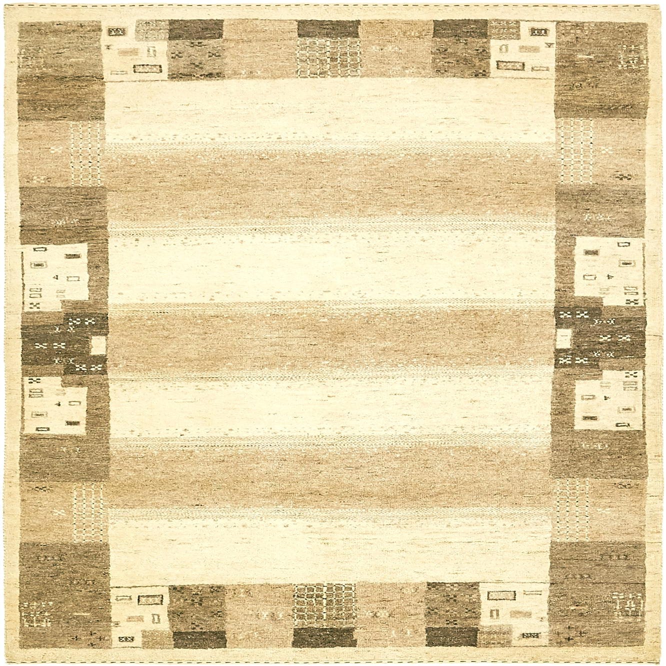 A 4x6 rectangular Kashkuli Gabbeh rug in ivories and creams, featuring a striped center and a patterned border.