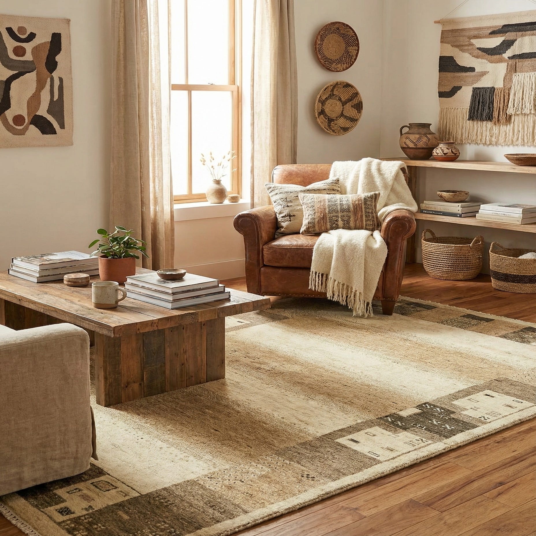 This rug would be well-suited for spaces aiming for a warm, natural feel such as modern farmhouses, Scandinavian-inspired interiors, or any setting where a touch of understated elegance is desired. It can serve as a grounding element in a minimalist design or as a complementary piece amongst more traditional furnishings. The Kashkuli Gabbeh's adaptable color palette and engaging design would make it a thoughtful choice for creating an inviting and cohesive space.