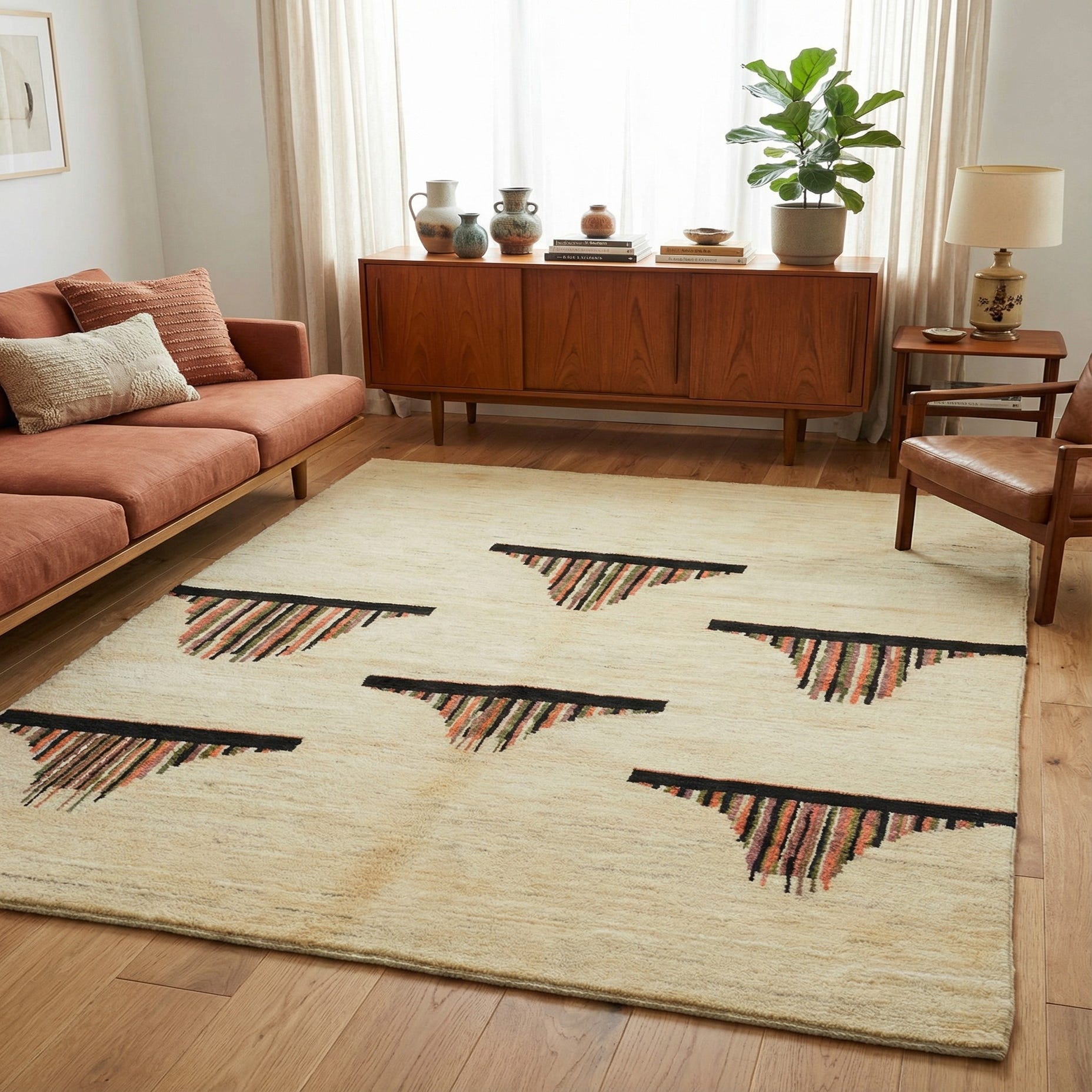 A 4x6 rectangular ivory wool rug featuring a modern abstract pattern of five black, orange, and green striped fan-like shapes.