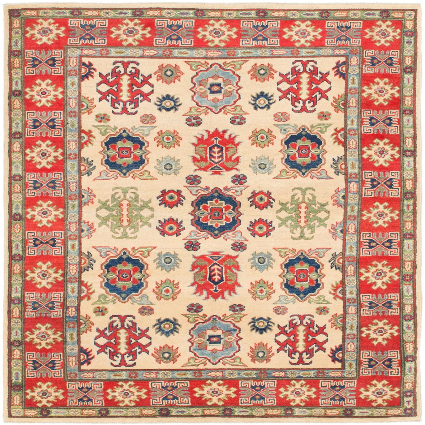 A 4x6 rectangular ivory Kazak rug with a red border and traditional tribal patterns in blue, red, and green.