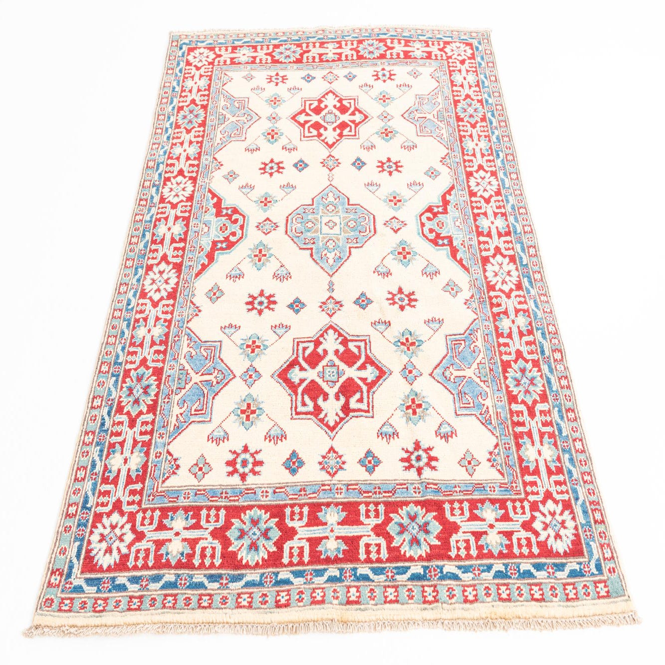 A 4x6 rectangular ivory rug with traditional Southwestern and Oriental patterns in deep red and light blue.