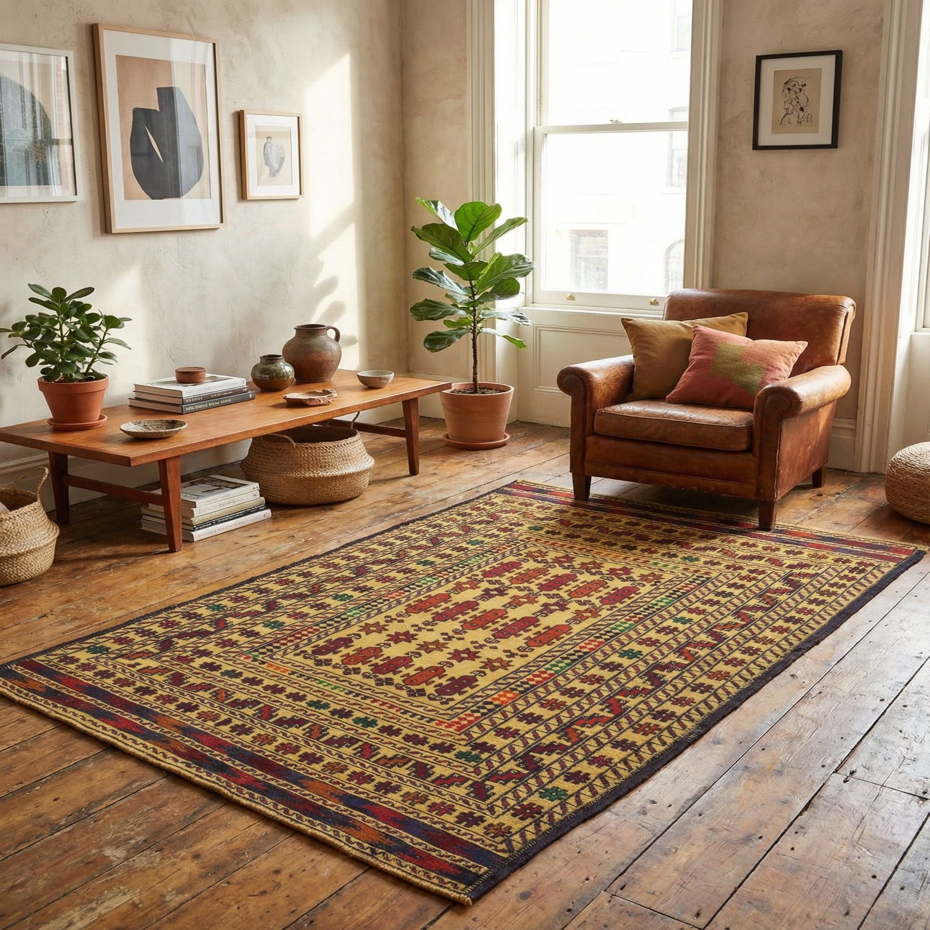 Ideal for adding warmth and a touch of cultural authenticity, this rug can seamlessly integrate into eclectic interiors, rustic settings, or rooms that embrace a global aesthetic. Its medium size makes it versatile for various applications such as anchoring a small seating area, serving as a statement piece in an entryway, or adding character to a home office. The sturdy wool construction ensures durability, making it well-suited for spaces that see regular use.