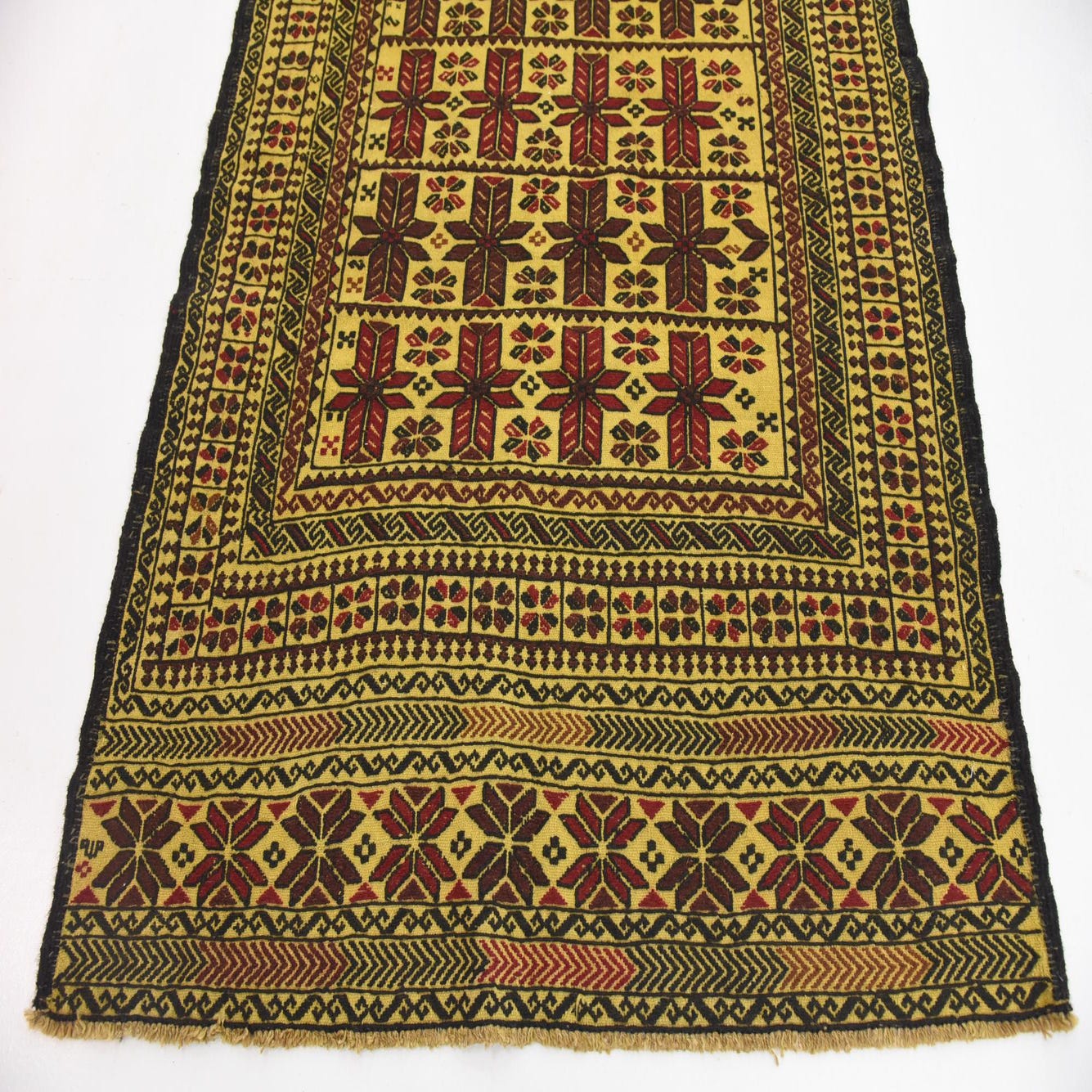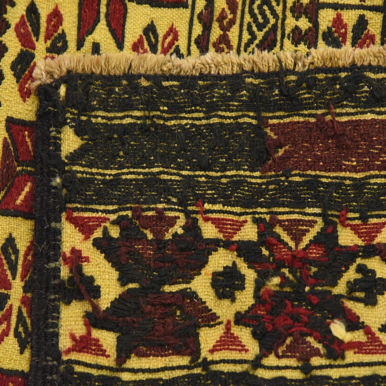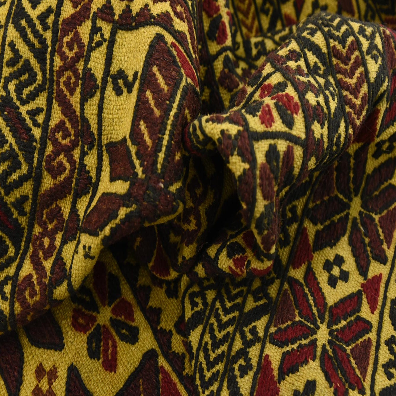 A 4x6 rectangular Kilim Afghan rug featuring a vibrant yellow field with red and brown tribal patterns, ideal for a living room.