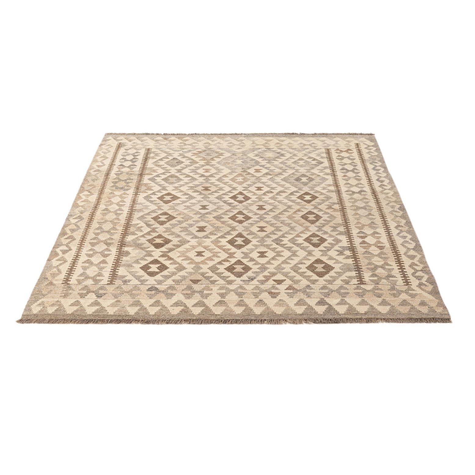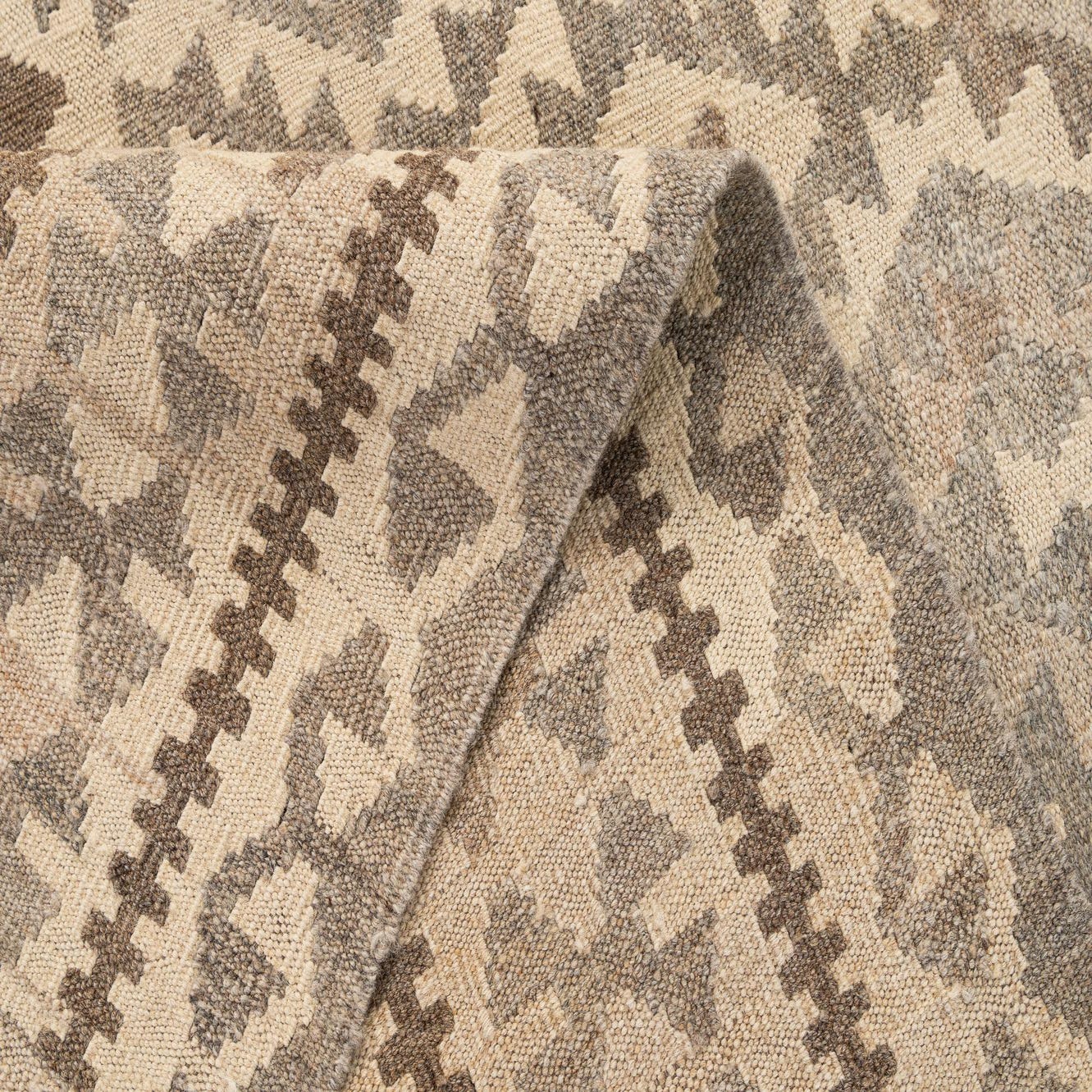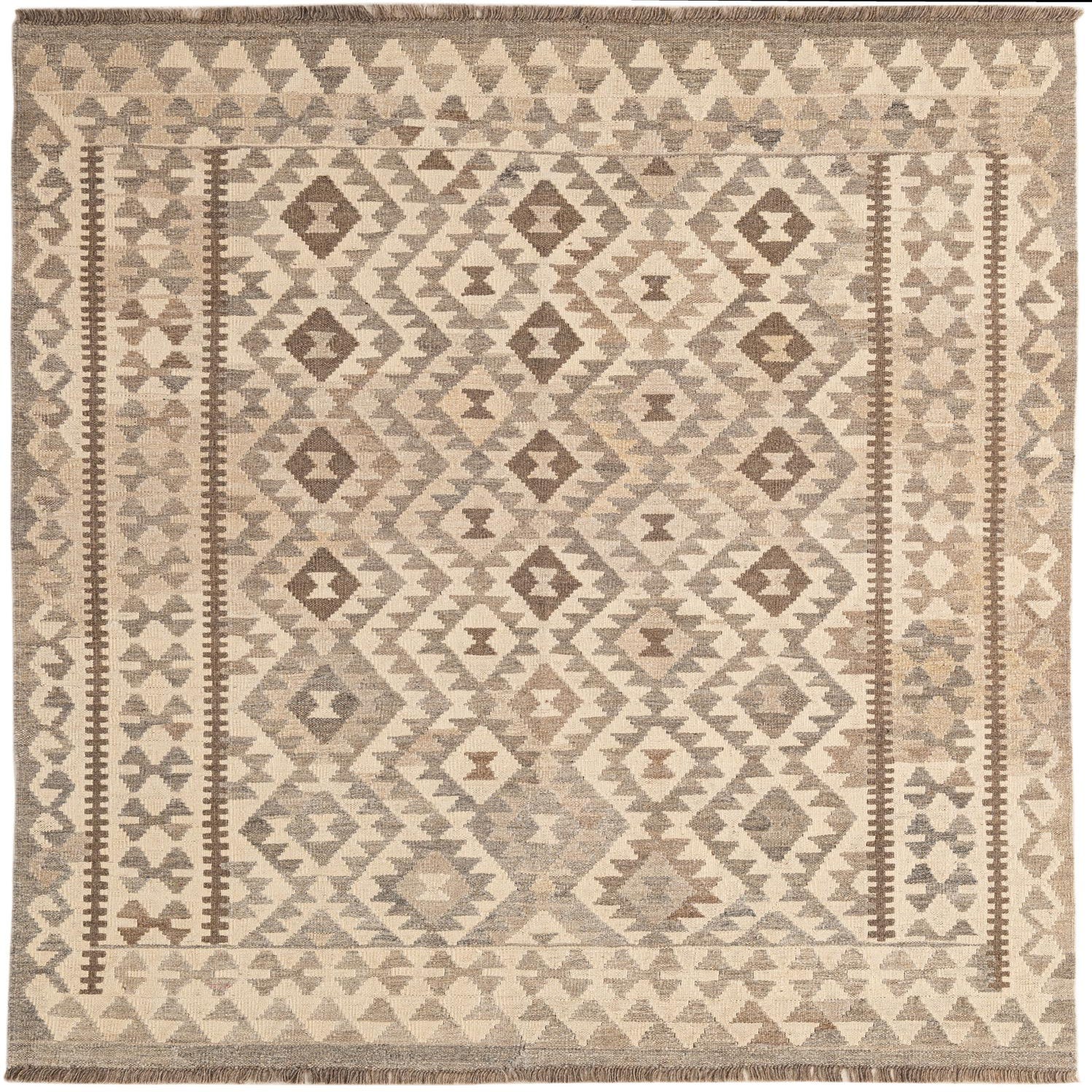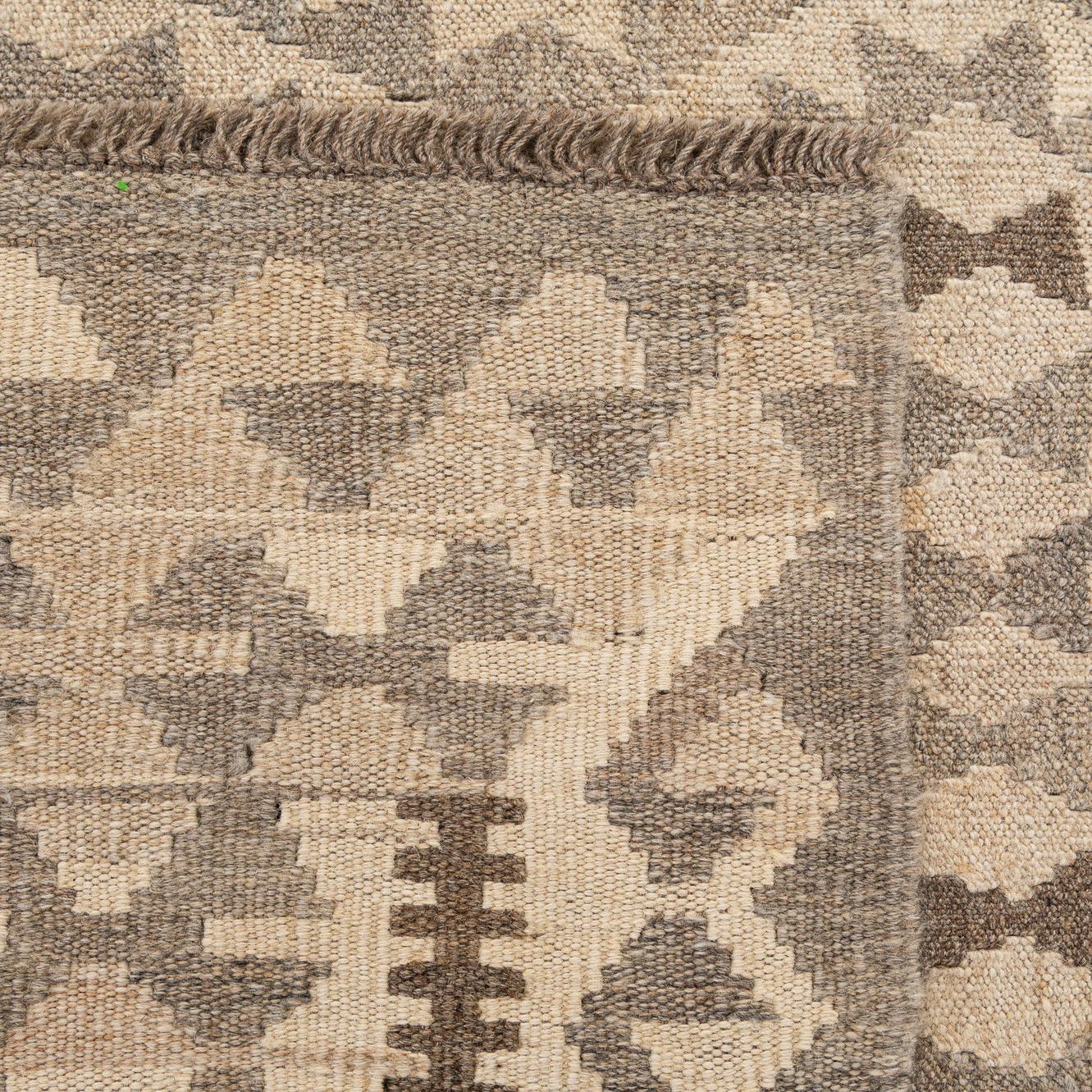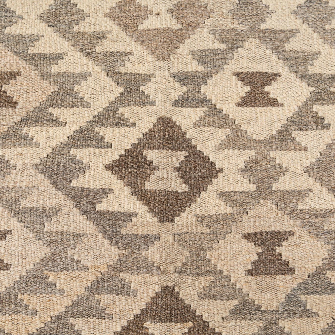 A 4x6 rectangular Kilim Maymana rug featuring a tribal geometric pattern in shades of ivory, cream, and brown.