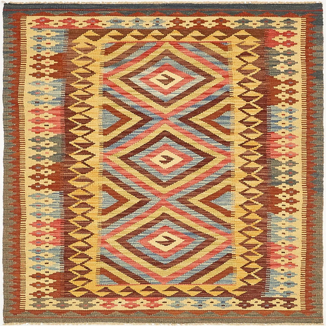A 4x6 rectangular Kilim Maymana rug with a tribal geometric pattern in ivory, red, blue, and brown tones.