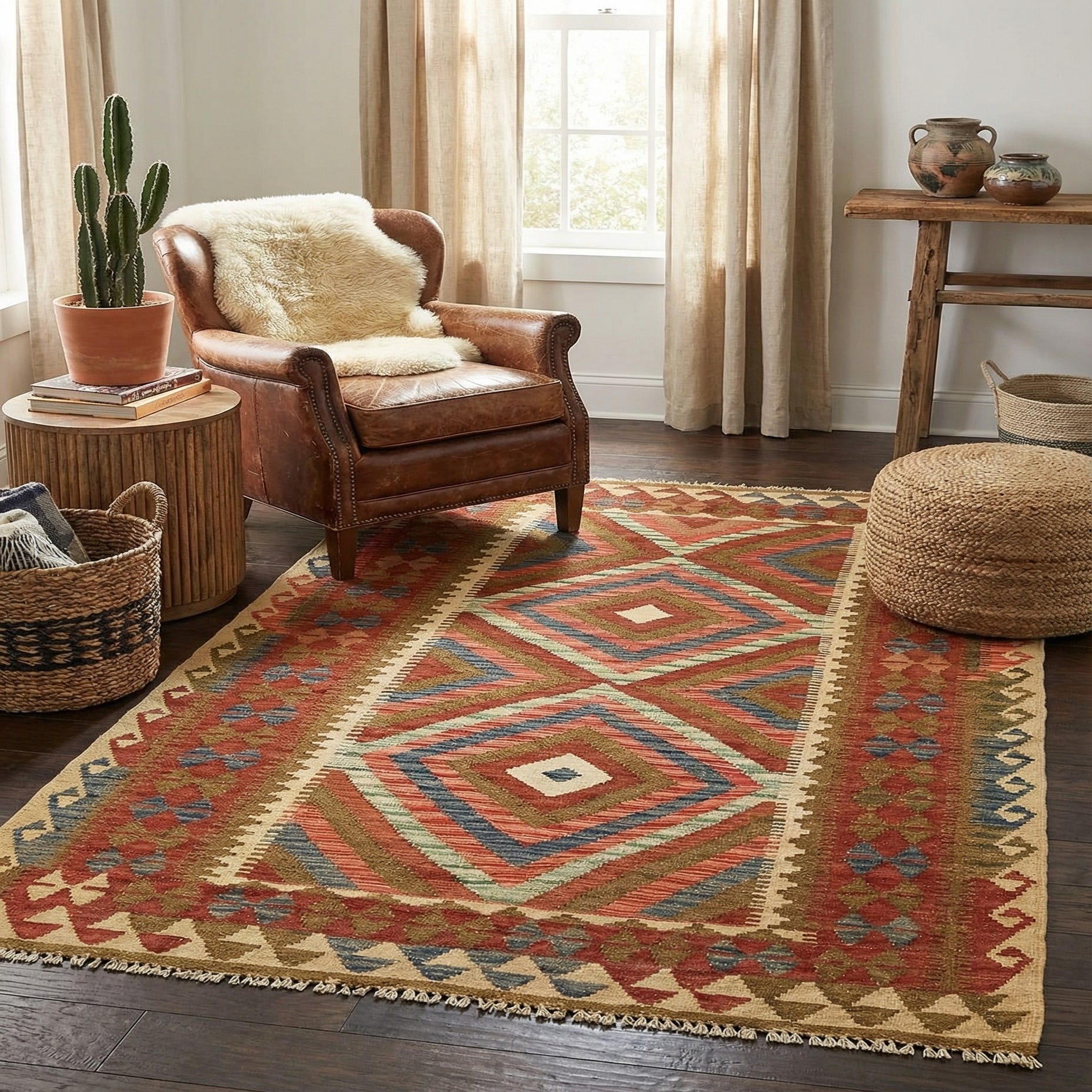 A 4x6 rectangular Kilim Maymana rug featuring a tribal medallion pattern in ivories, creams, reds, blues, and browns.