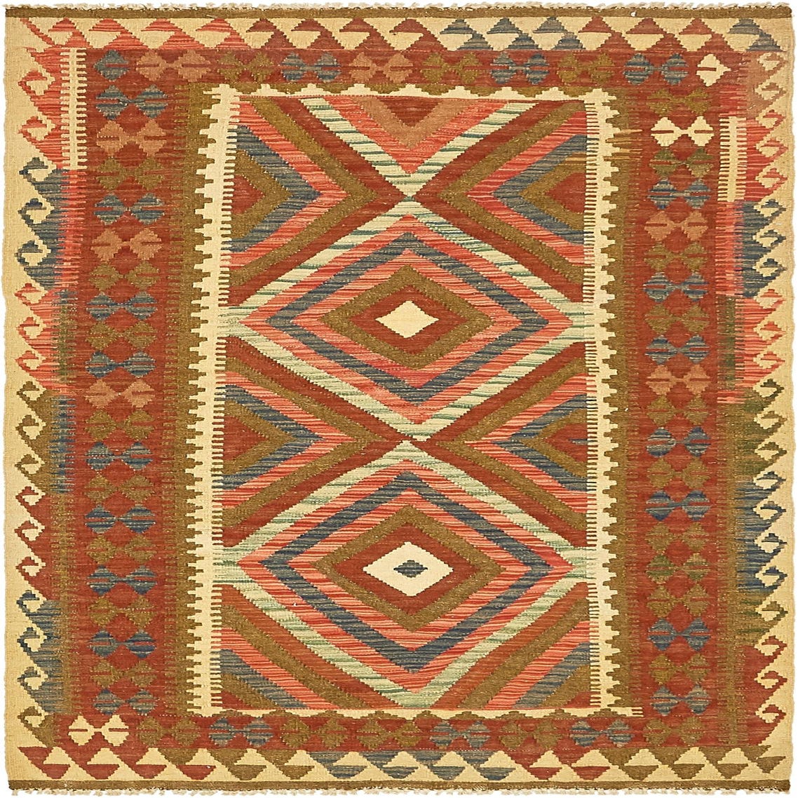 Primary color is Cream. Colors in this rug include: Cream, Blue, Burgundy, Red, Olive, Light Blue, Salmon.