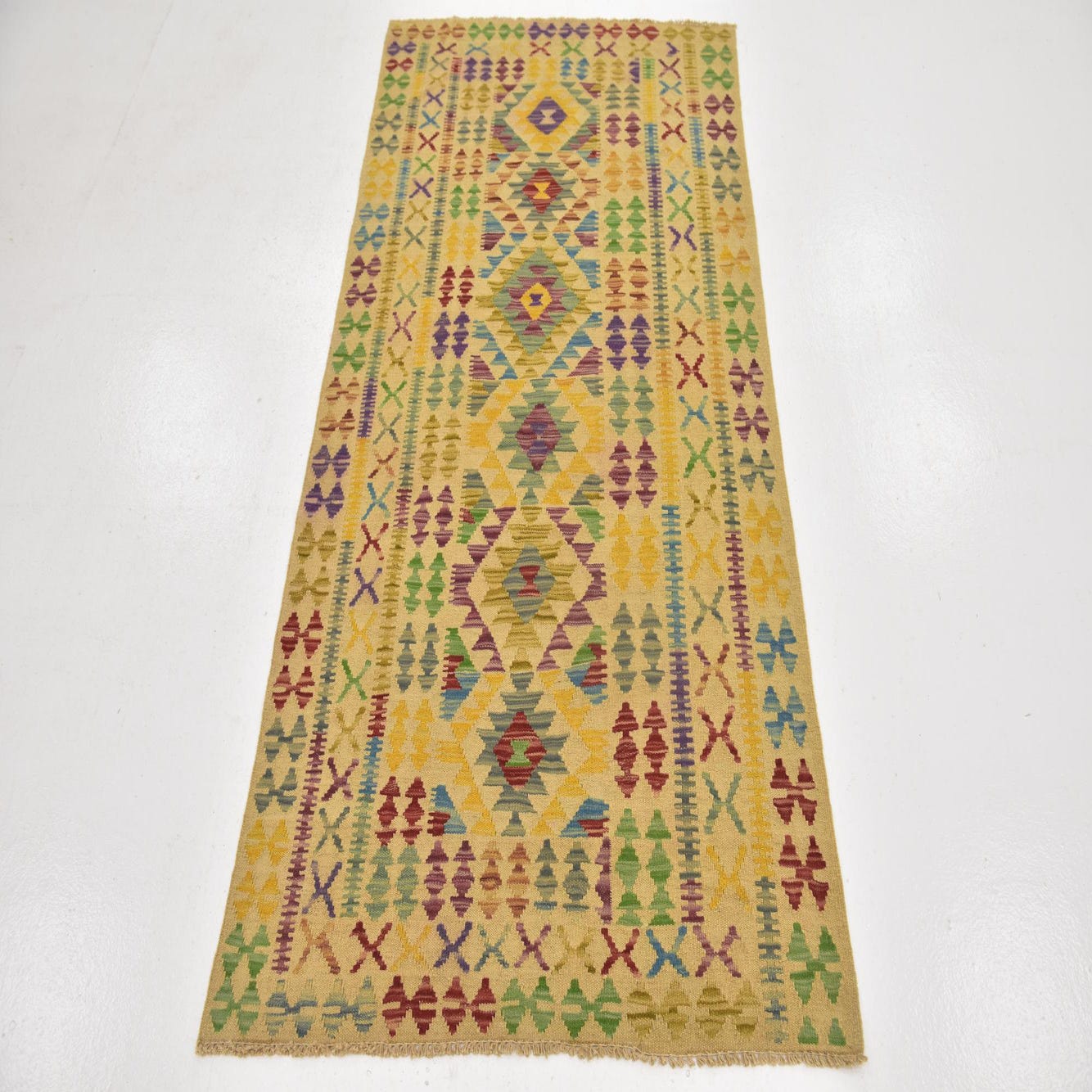 This Kilim Maymana rug is versatile in its styling potential, fitting well within bohemian, eclectic, or rustic interior settings. It can serve as a striking focal point in a minimalist room or complement the warmth of a space rich in wooden features and earthy tones. Its multicolored palette allows for coordination with a variety of color schemes, and its size is well-suited for living areas, home offices, or as an accent in larger spaces.