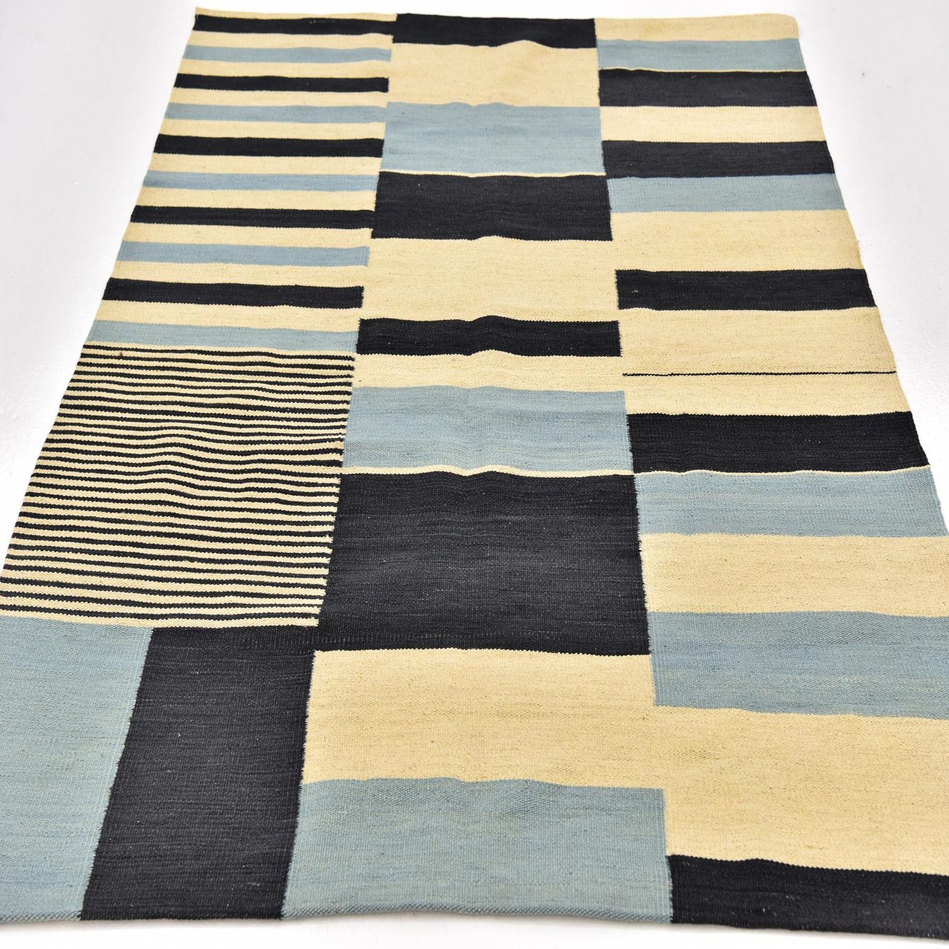 A 4x6 rectangular Kilim Modern rug with a contemporary tribal pattern in ivory, light blue, and dark blue stripes and blocks.