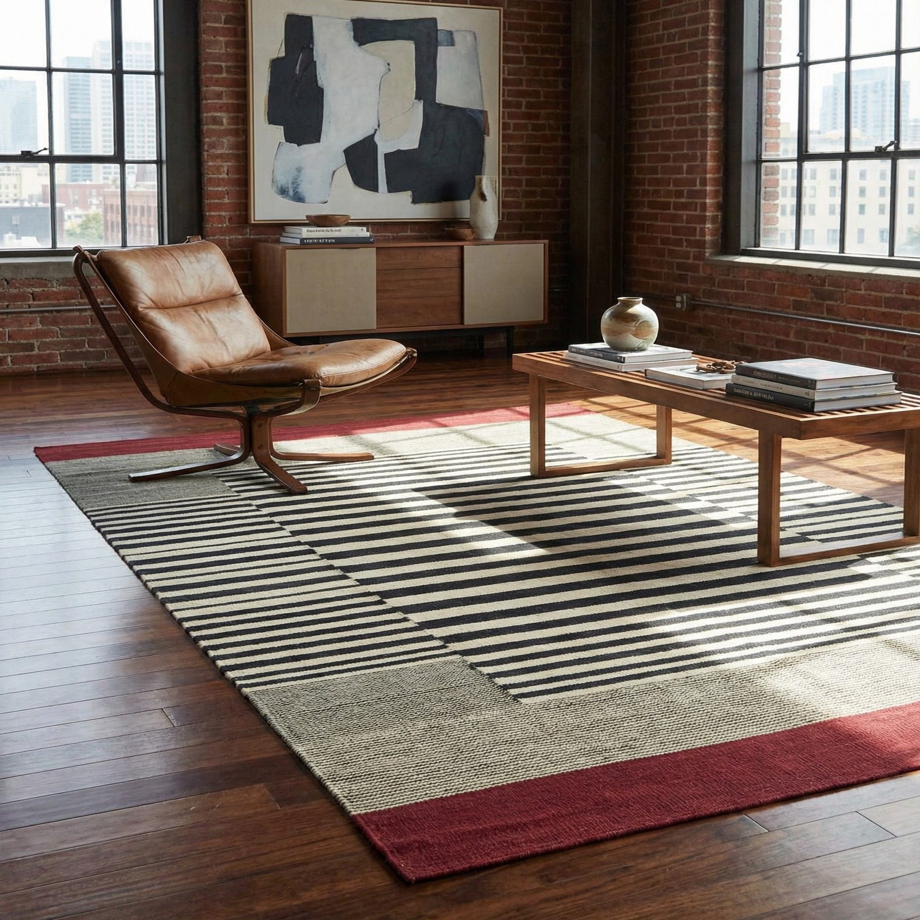 This rug works well in modern, transitional, or minimal interiors where clean geometry is a focus. Pair it with streamlined mid-century seating, warm wood tones, and leather accents to emphasize its linear quality, or soften the contrast with plush throws and layered textiles in a relaxed living room. It also suits an entryway or home office to define a compact area without adding pile, and it can anchor a small dining setup or reading nook where the graphic pattern brings visual order and a touch of color.