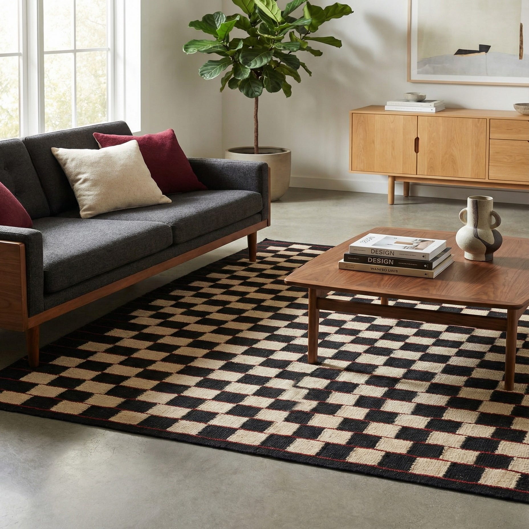 The striking contrast of the cream base against the sharp black and red accents allows this rug to serve as either a focal point or a complement to a variety of decor styles. Its versatile pattern seamlessly integrates with minimalist, Scandinavian, and even eclectic design schemes. This rug could anchor a living space with modern furniture, add definition to an office setting, or provide an artistic touch to a simple bedroom layout. The Kilim Modern rug offers a touch of visual interest without overwhelming the surrounding interior elements.