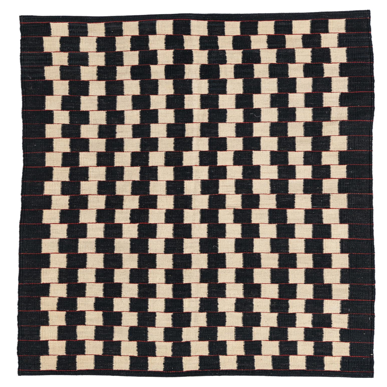 A 4x6 rectangular flatweave wool rug featuring a bold checkerboard pattern in black and ivory, with subtle red accents.