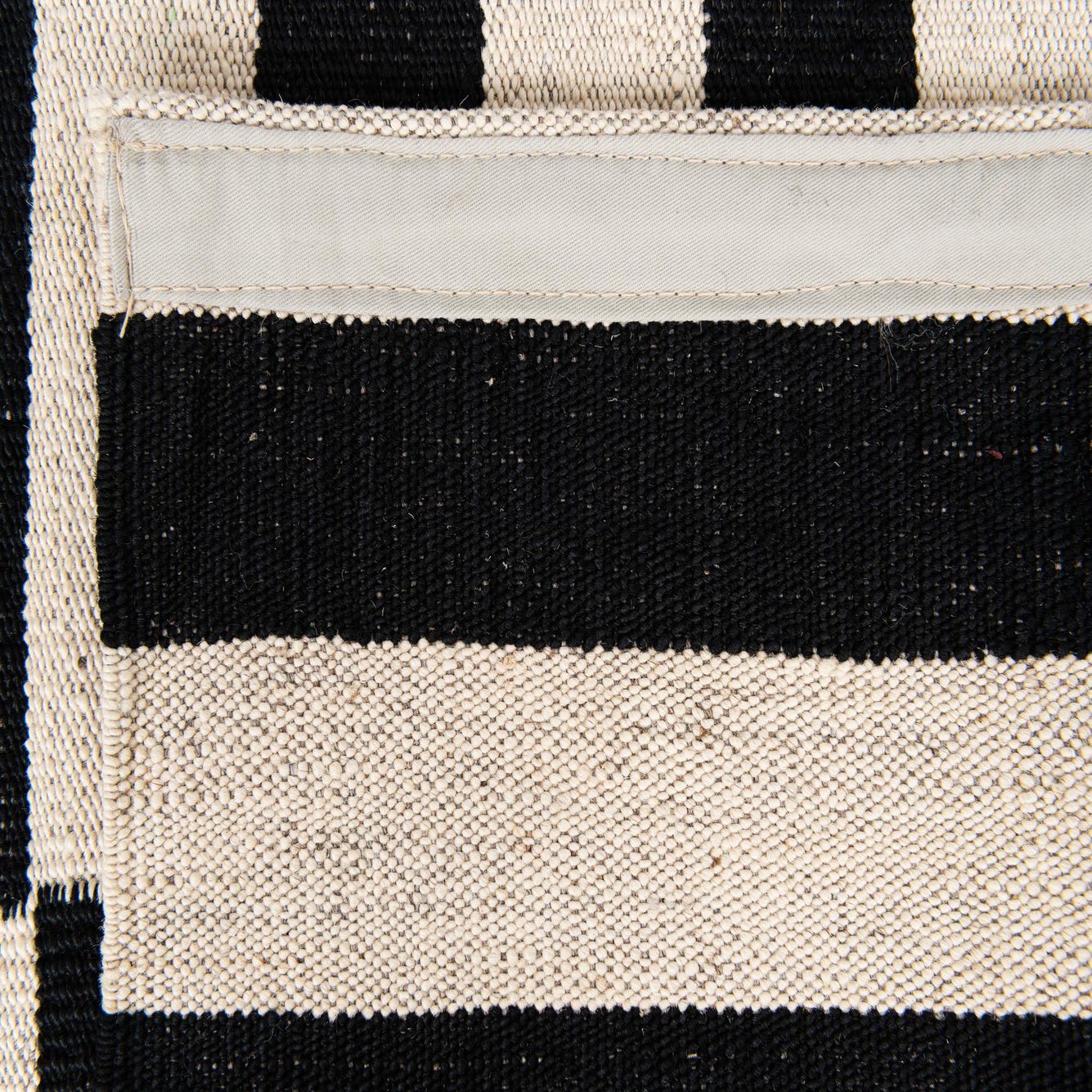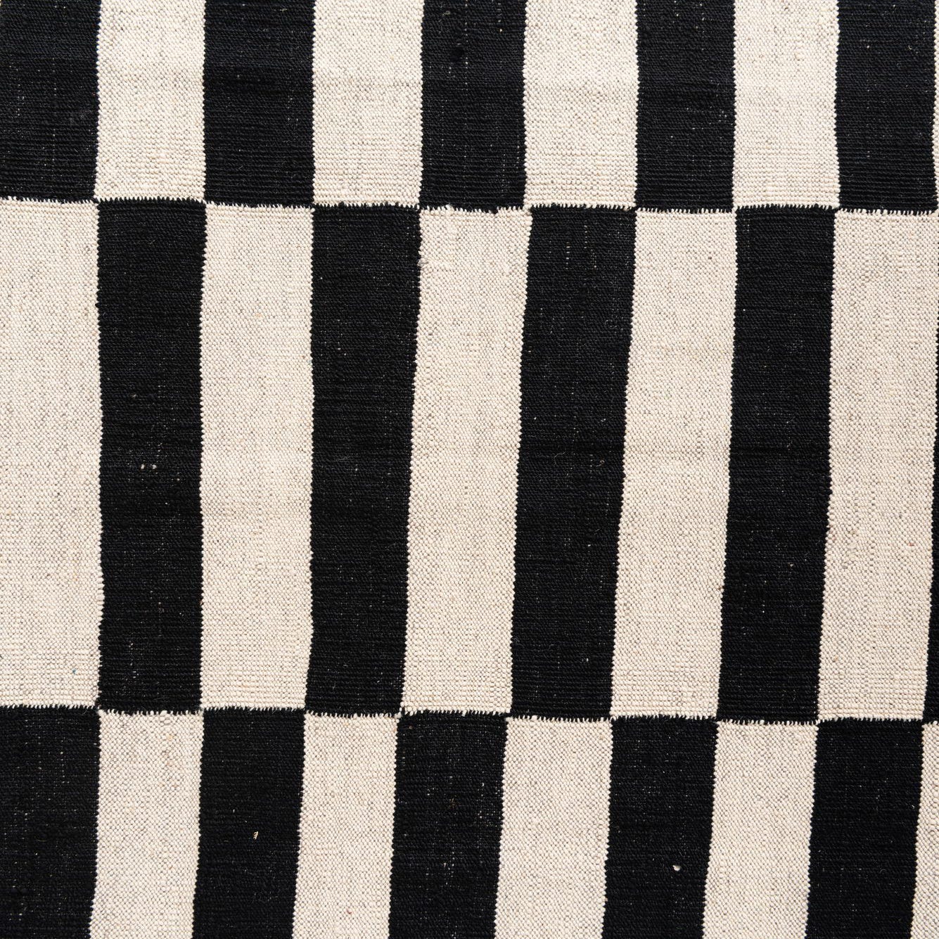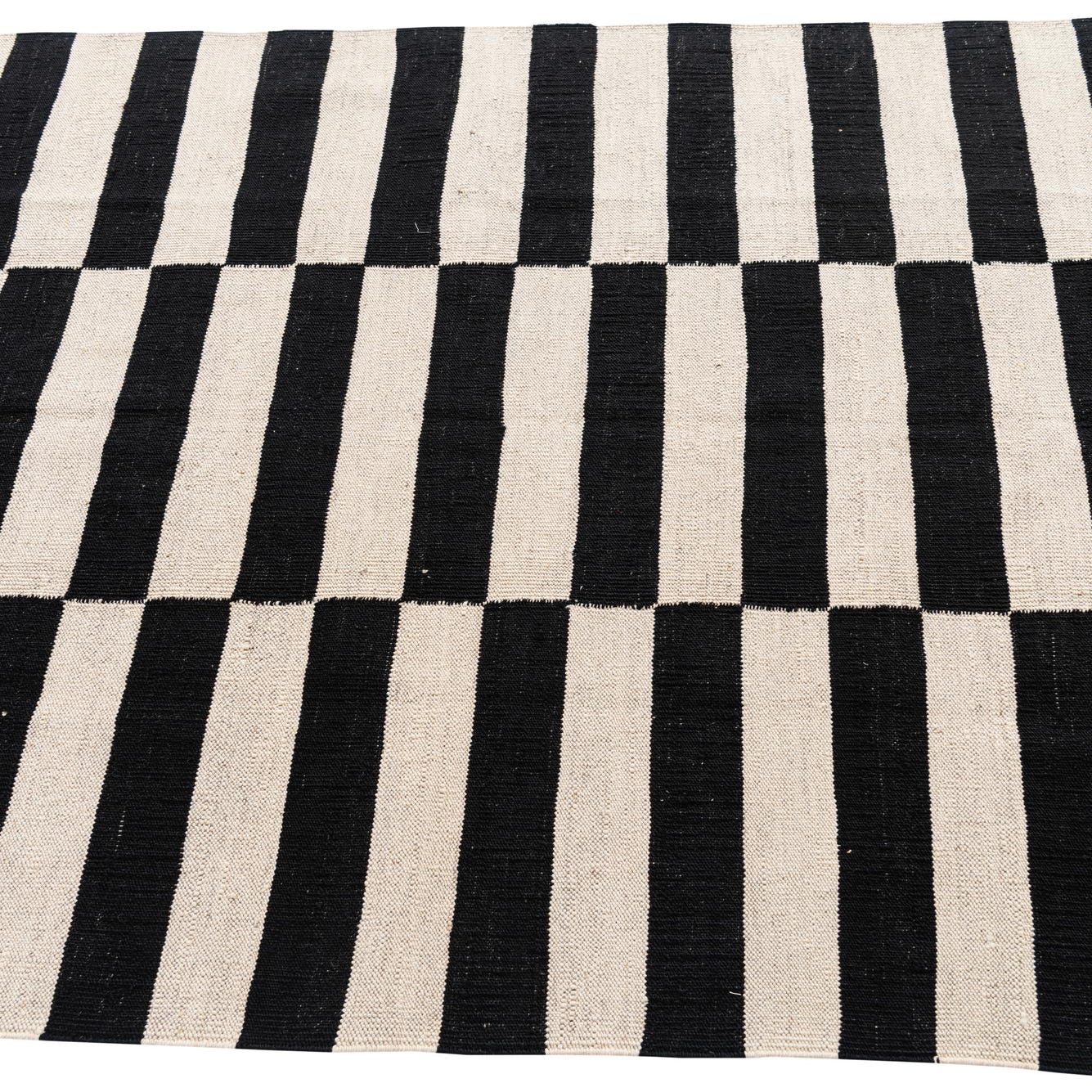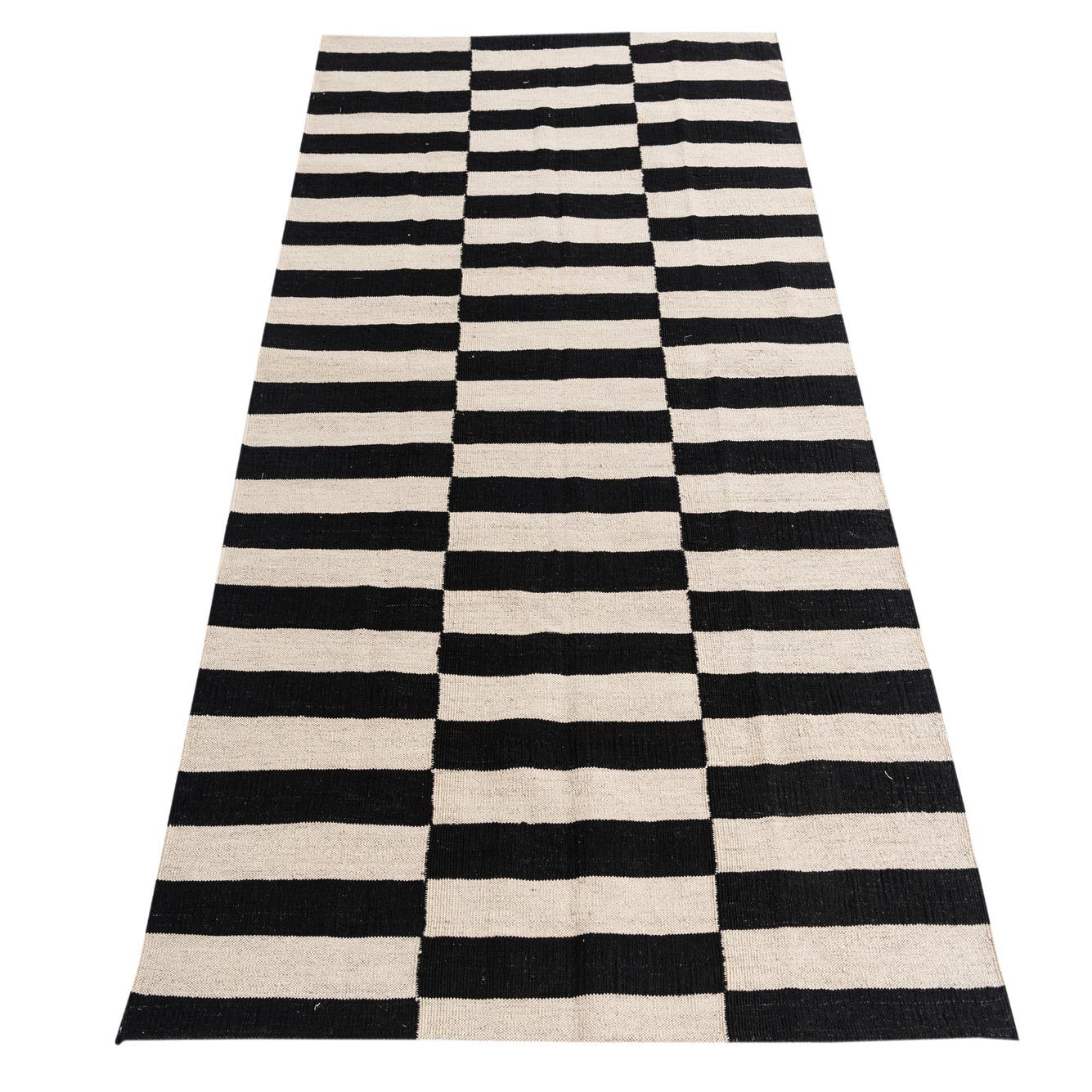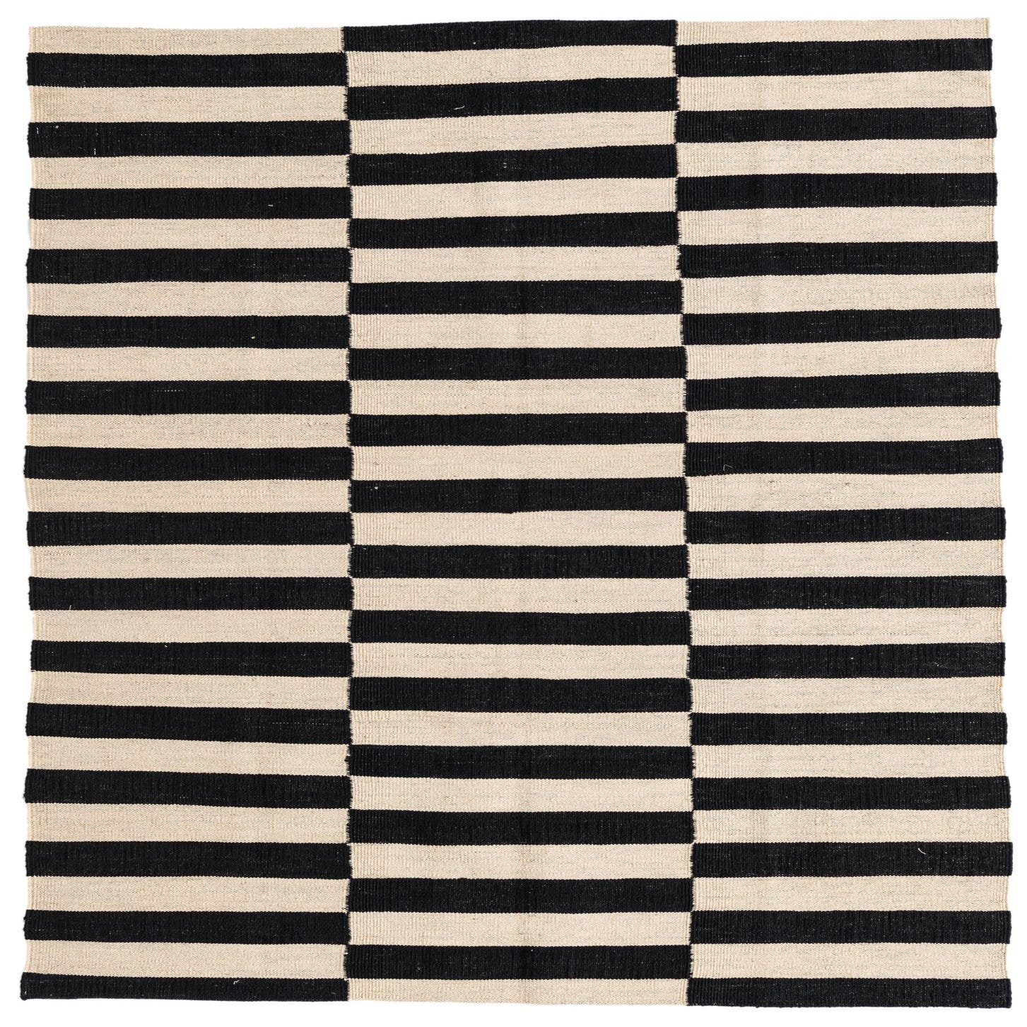 A 4x6 rectangular Kilim Modern rug with bold black and ivory horizontal stripes, arranged in three vertical blocks.