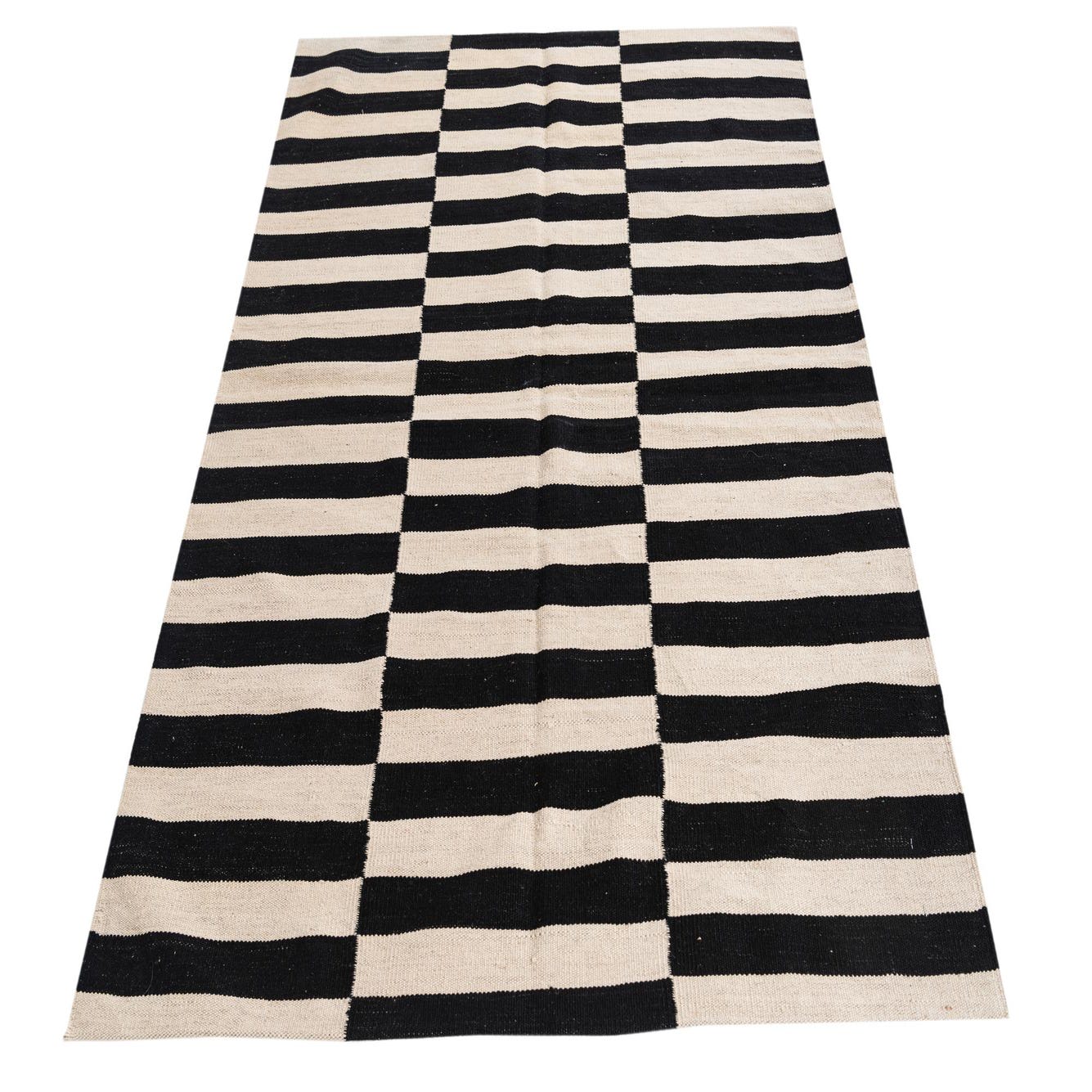 A 4x6 rectangular Kilim Modern rug with a bold black and ivory stripe pattern, perfect for a living room.