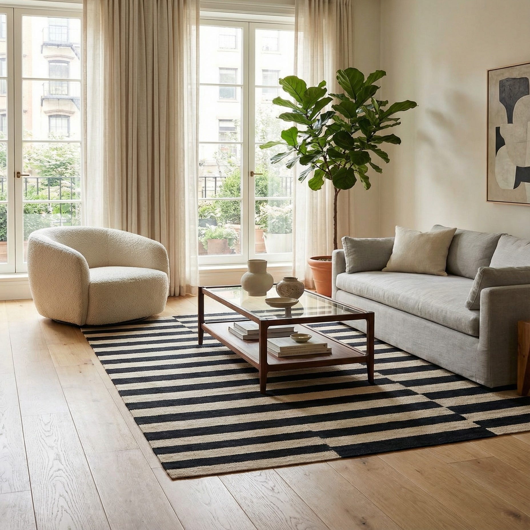 The simplicity of the design allows for versatile placement within a variety of interior design scenarios. This rug would complement a minimalist decor by adding a touch of graphic impact without overpowering the space. It is equally suitable for a Scandinavian-inspired room, where its natural wool texture and clean lines would blend seamlessly with the aesthetic of functional and uncluttered spaces. Additionally, this rug could serve as a grounding element in a more eclectic setting, providing a balanced visual anchor amidst a mix of patterns and colors.