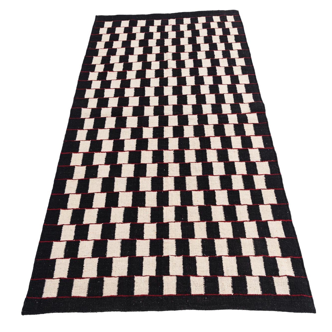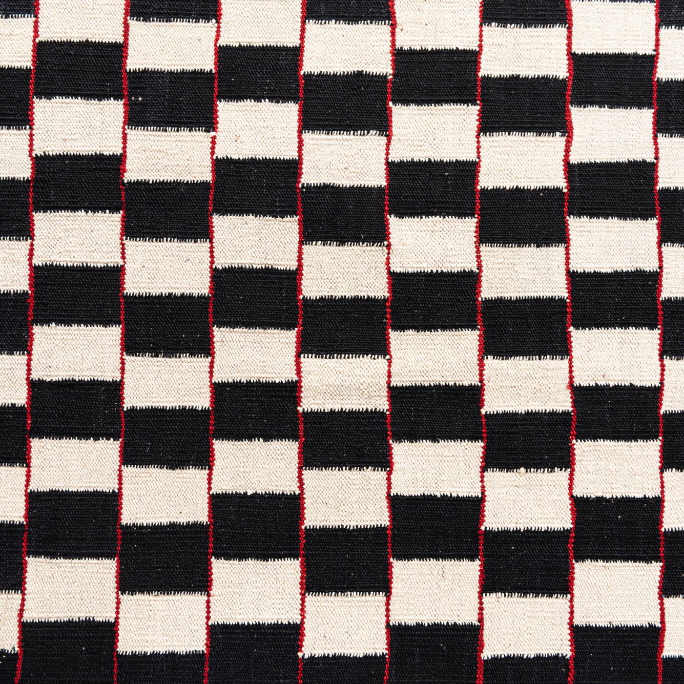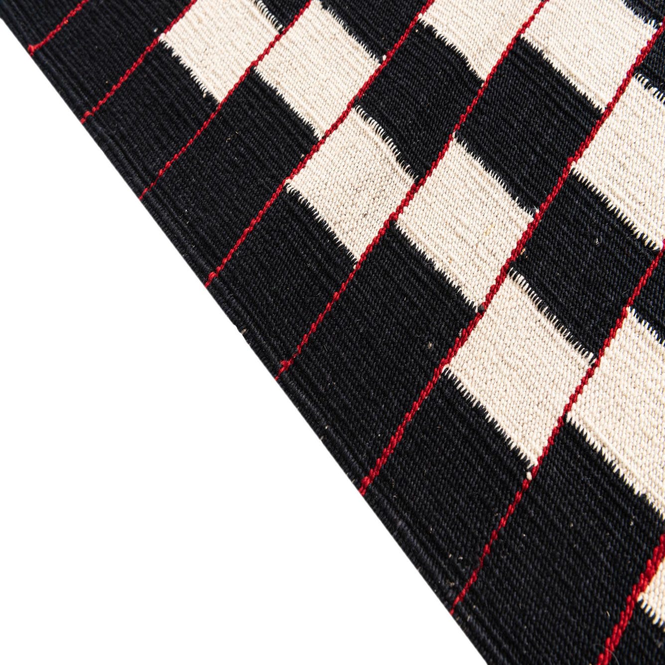 From the Kilim Modern collection, this hand-woven 4x6 rug is a testament to skilled craftsmanship with its appealing geometric pattern and balanced use of color. The rug features a cream background with a dynamic, black and red checkerboard design, creating a striking visual contrast. Its 100% wool composition lends a palpable warmth and texture that ensures comfort underfoot.