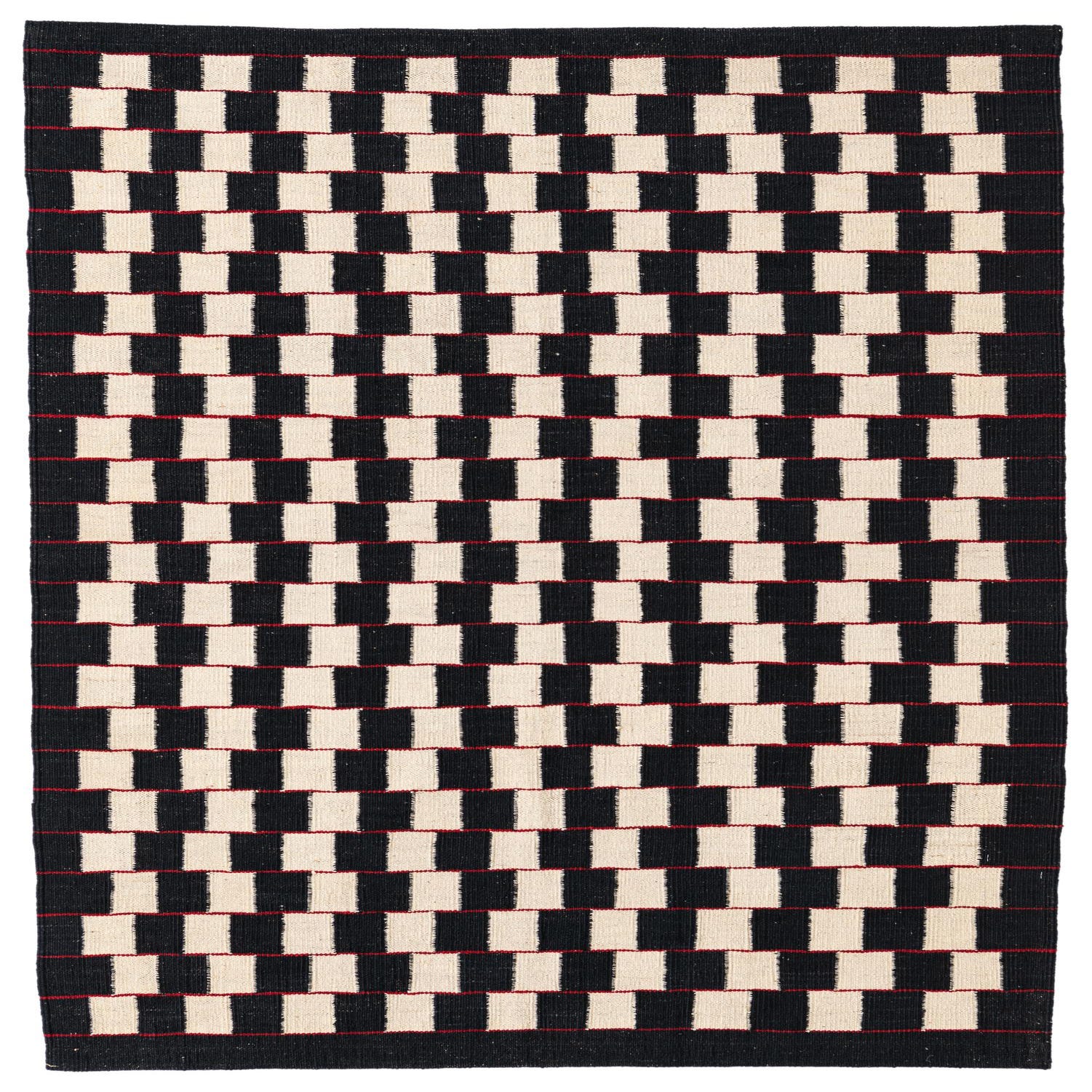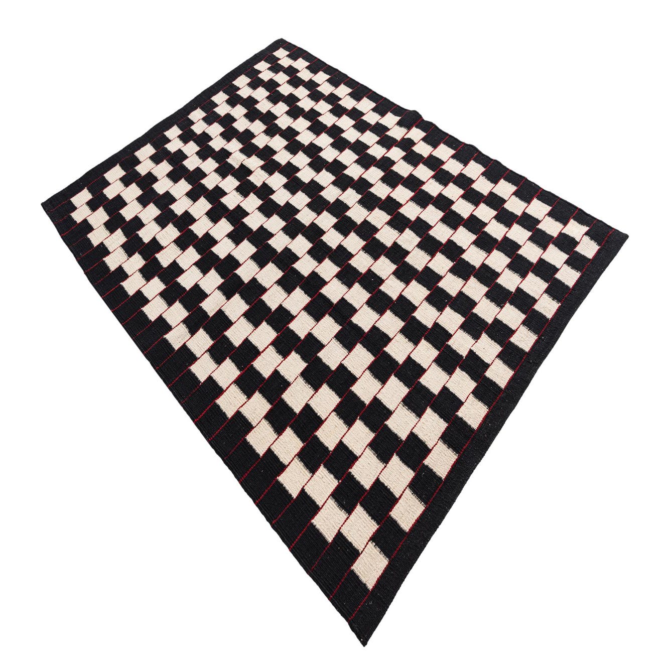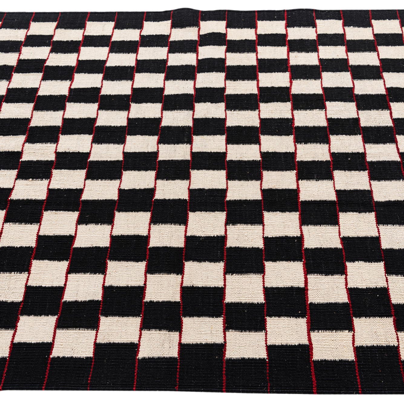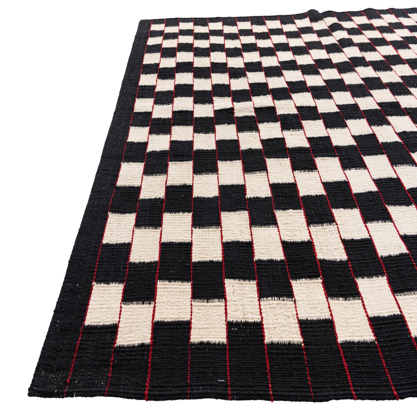 From the Kilim Modern collection, this hand-woven 4x6 rug is a testament to skilled craftsmanship with its appealing geometric pattern and balanced use of color. The rug features a cream background with a dynamic, black and red checkerboard design, creating a striking visual contrast. Its 100% wool composition lends a palpable warmth and texture that ensures comfort underfoot.