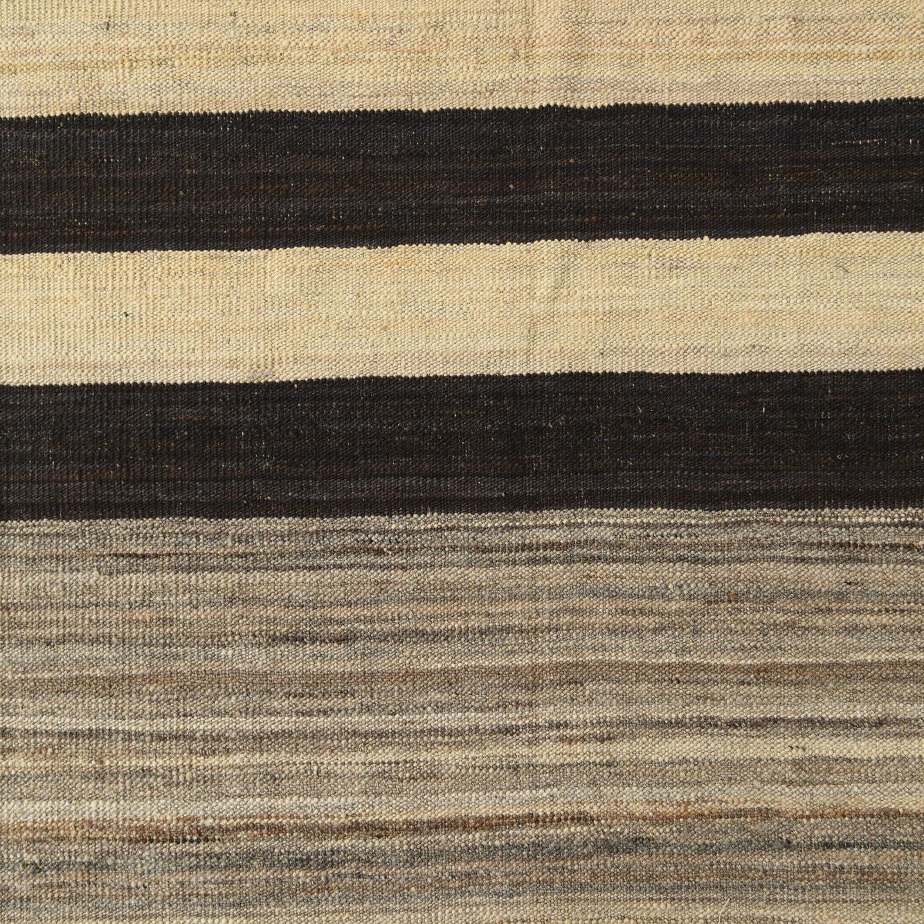 A 4x6 rectangular Kilim Modern rug with horizontal stripes in varying shades of ivory, cream, and dark brown, showcasing a flatweave texture.