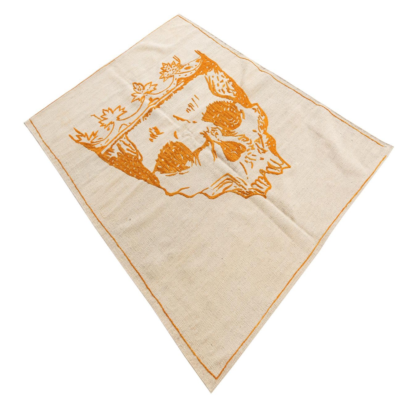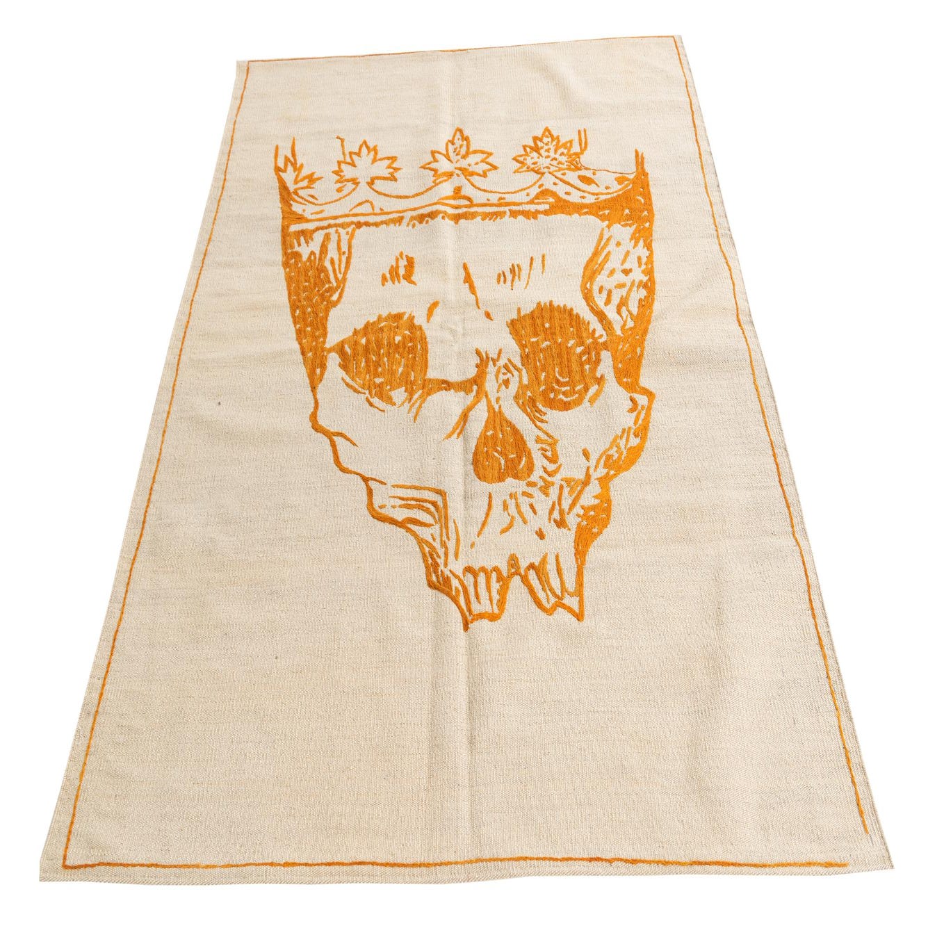 A 4x6 rectangular ivory flatweave rug featuring a large, stylized orange skull wearing a crown with leaf motifs.