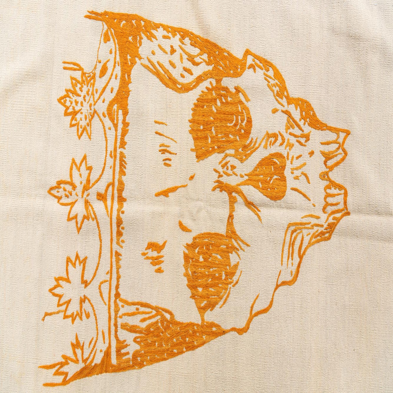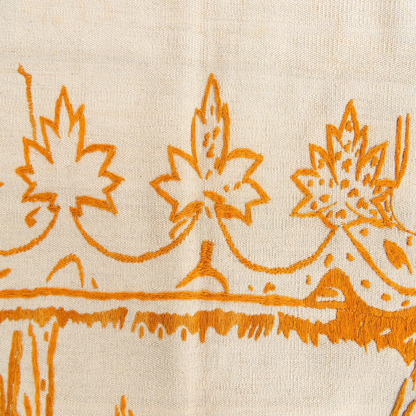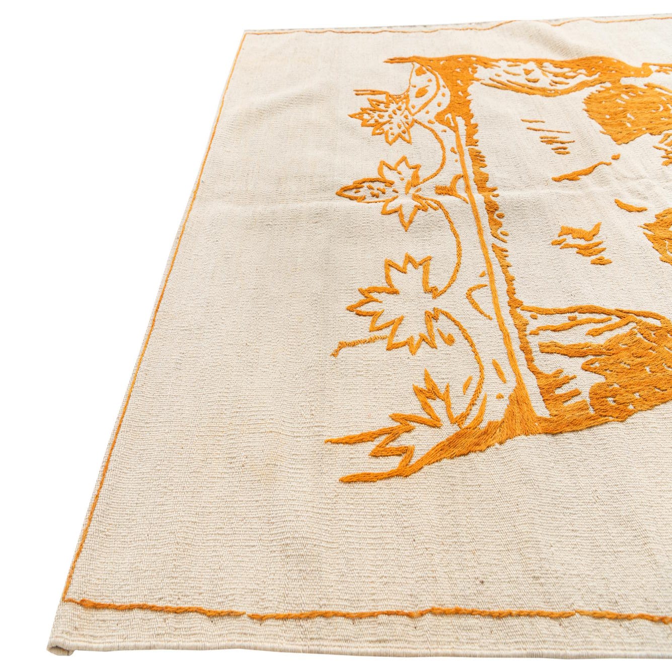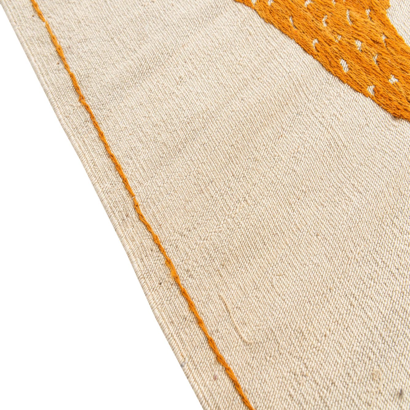 The striking contrast between the orange motif and the cream canvas offers versatility to this rug, making it suitable for various interior design scenarios. It can act as a focal point in a minimalist setting or complement a bohemian or eclectic styled room with ease. The clean lines and folkloric patterns are well-suited for spaces that embrace cultural influences or appreciate handmade craftsmanship.