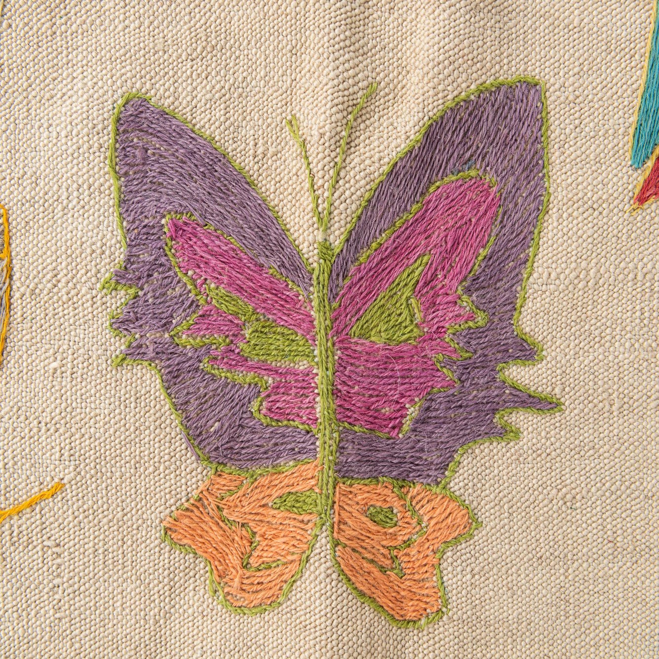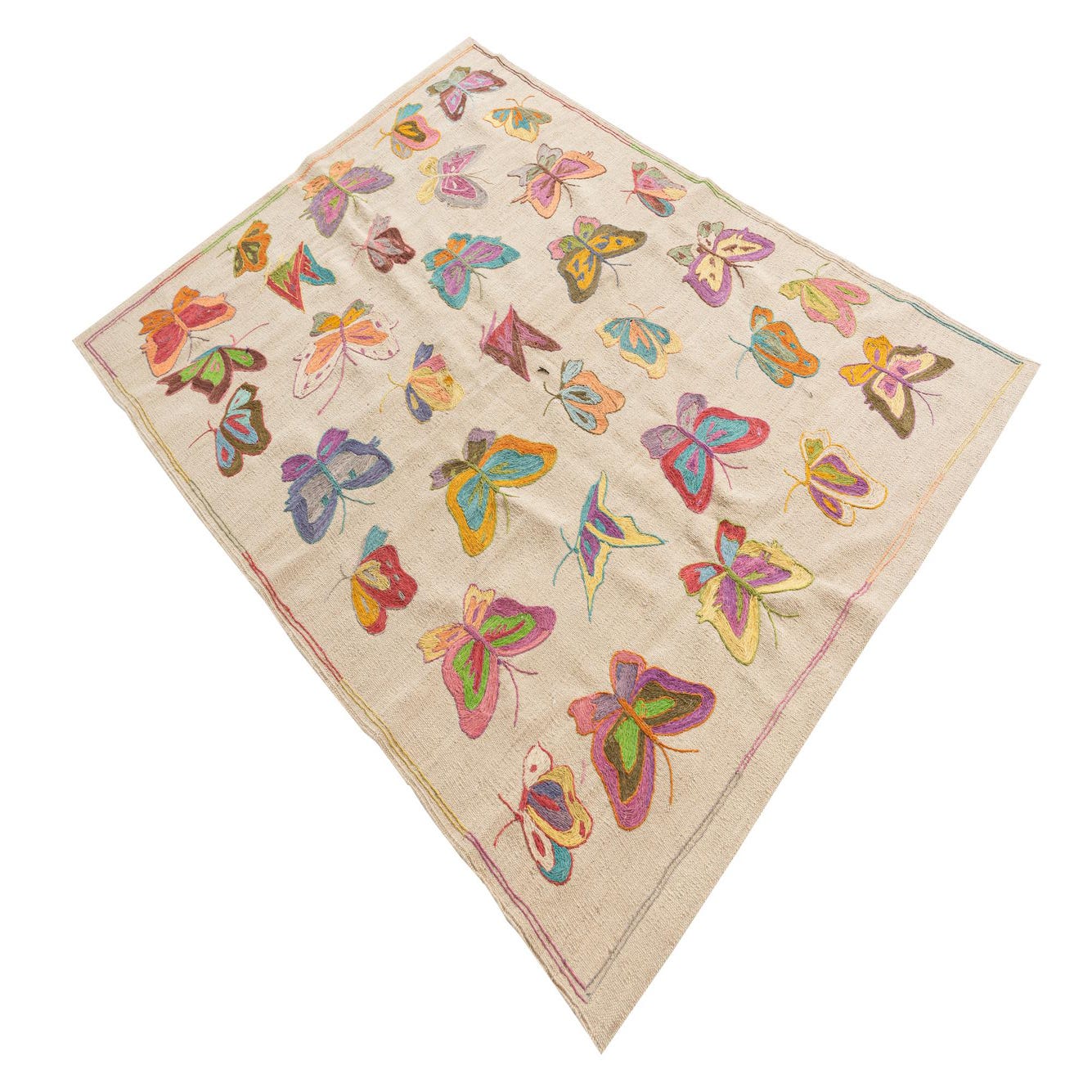 Hand-woven of 100% wool, this flatwoven rug rests on a warm cream ground patterned with an array of stitched butterfly motifs. Each butterfly is rendered in lively shades of blue, teal, violet, red, orange, gold, olive, brown, gray and beige, arranged in informal rows with a narrow multicolor running border. The embroidered motifs sit slightly raised against the smooth wool base, offering a soft, tactile texture that invites you to touch and feel the handcrafted stitchwork.