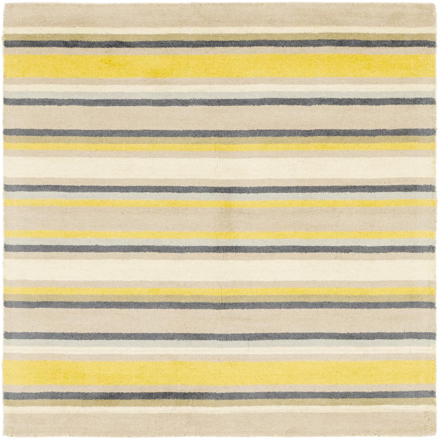 A 4x6 rectangular Luna rug featuring horizontal stripes in varying widths of ivory, cream, yellow, and gray.