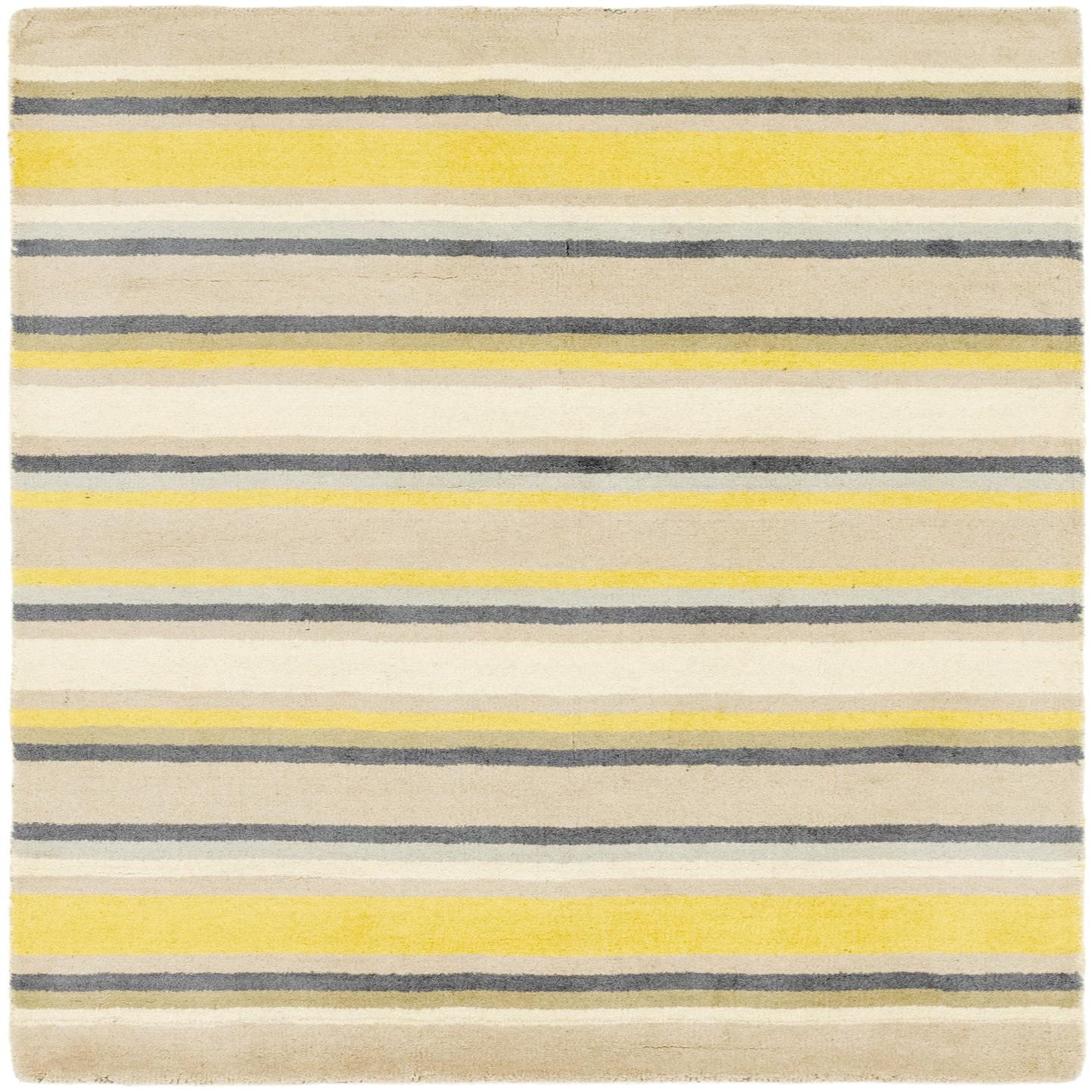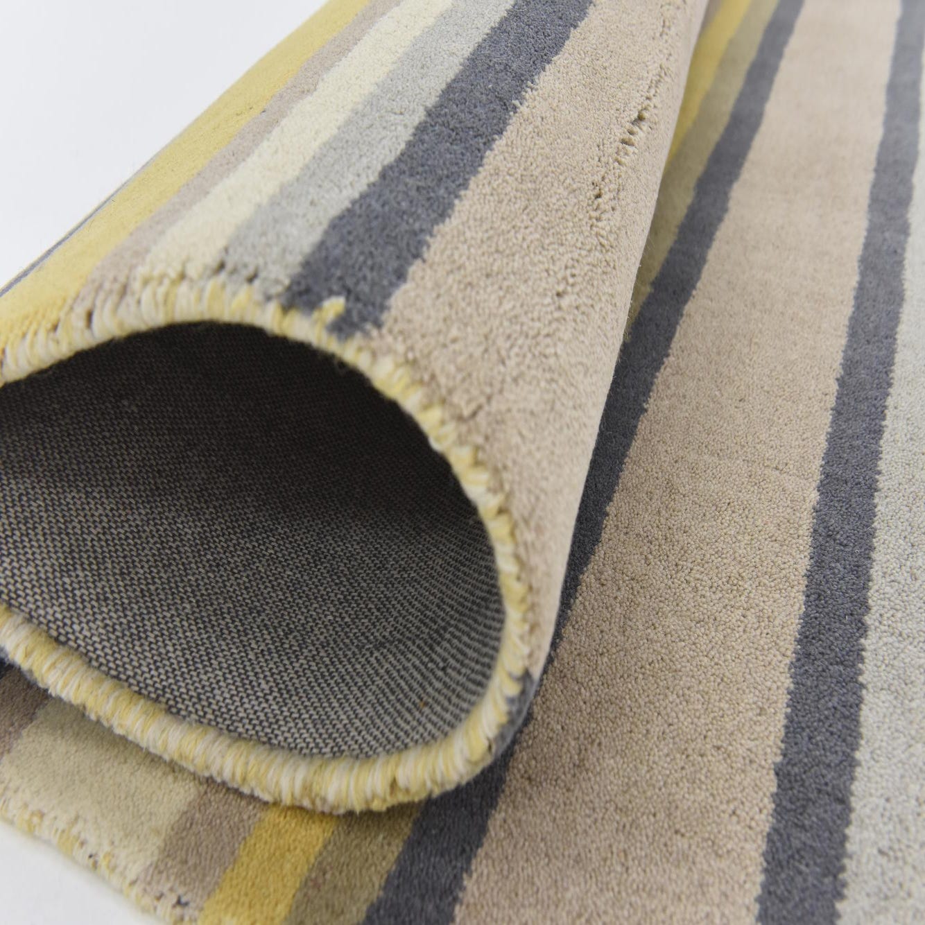 The Luna collection offers this hand-tufted 100% wool rug in a 4x6 size, presenting a durable and plush piece well-suited for various rooms. This rug features a cream background, complemented by horizontal stripes in a balanced palette of beige, gray, light blue, olive, and yellow. The subtle variations in stripe thickness create a harmonious visual rhythm across the surface, lending the piece versatility in design.