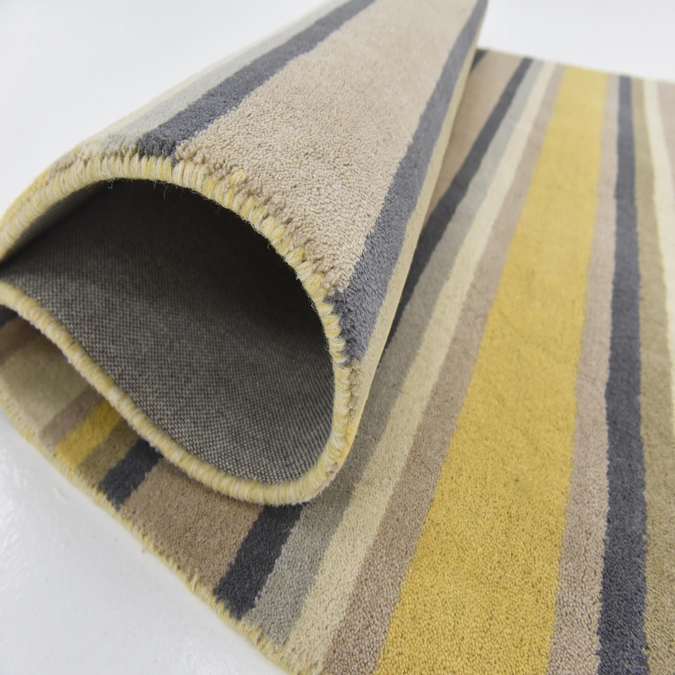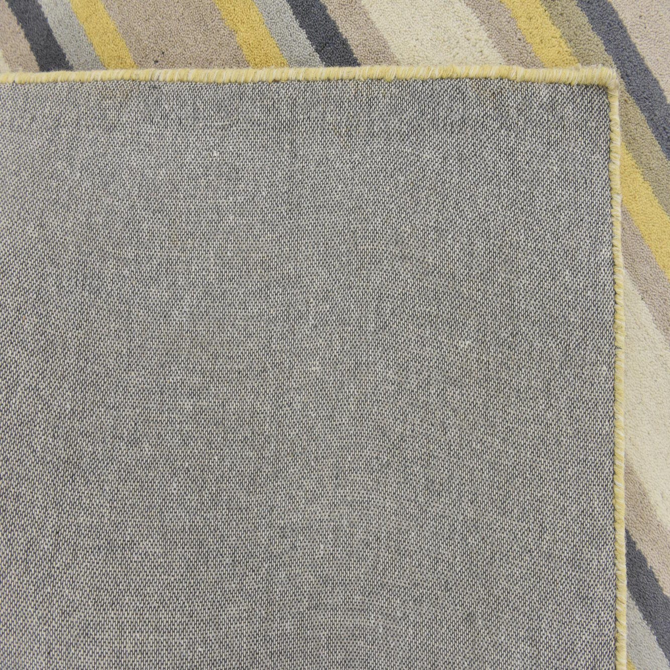 A 4x6 rectangular Luna rug featuring bold horizontal stripes in ivory, cream, yellow, and charcoal, suitable for a living room.