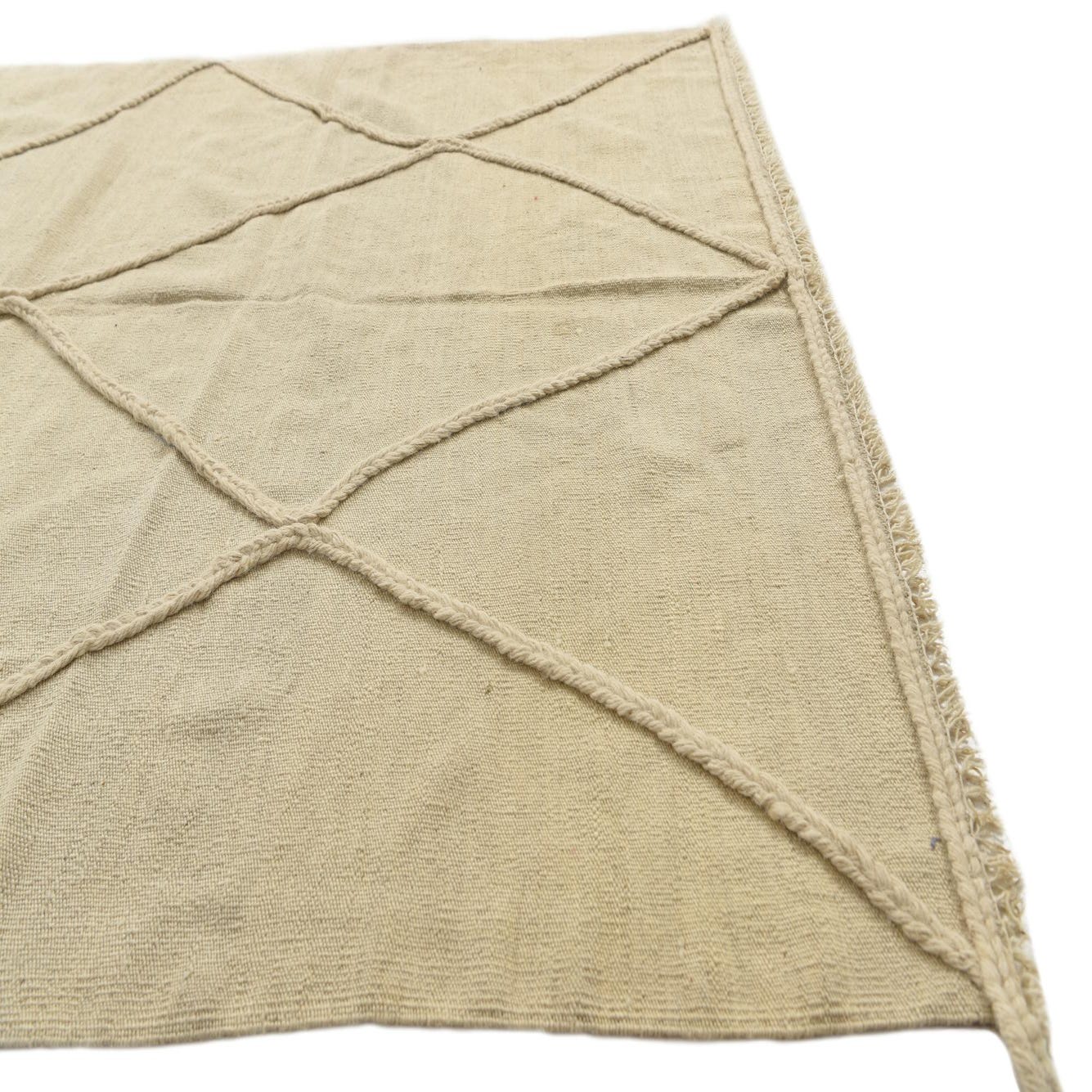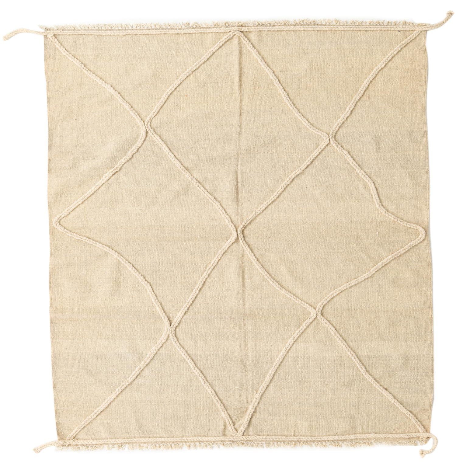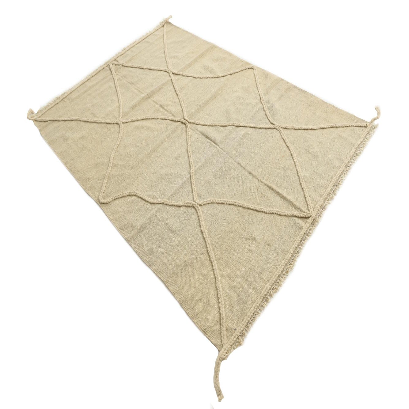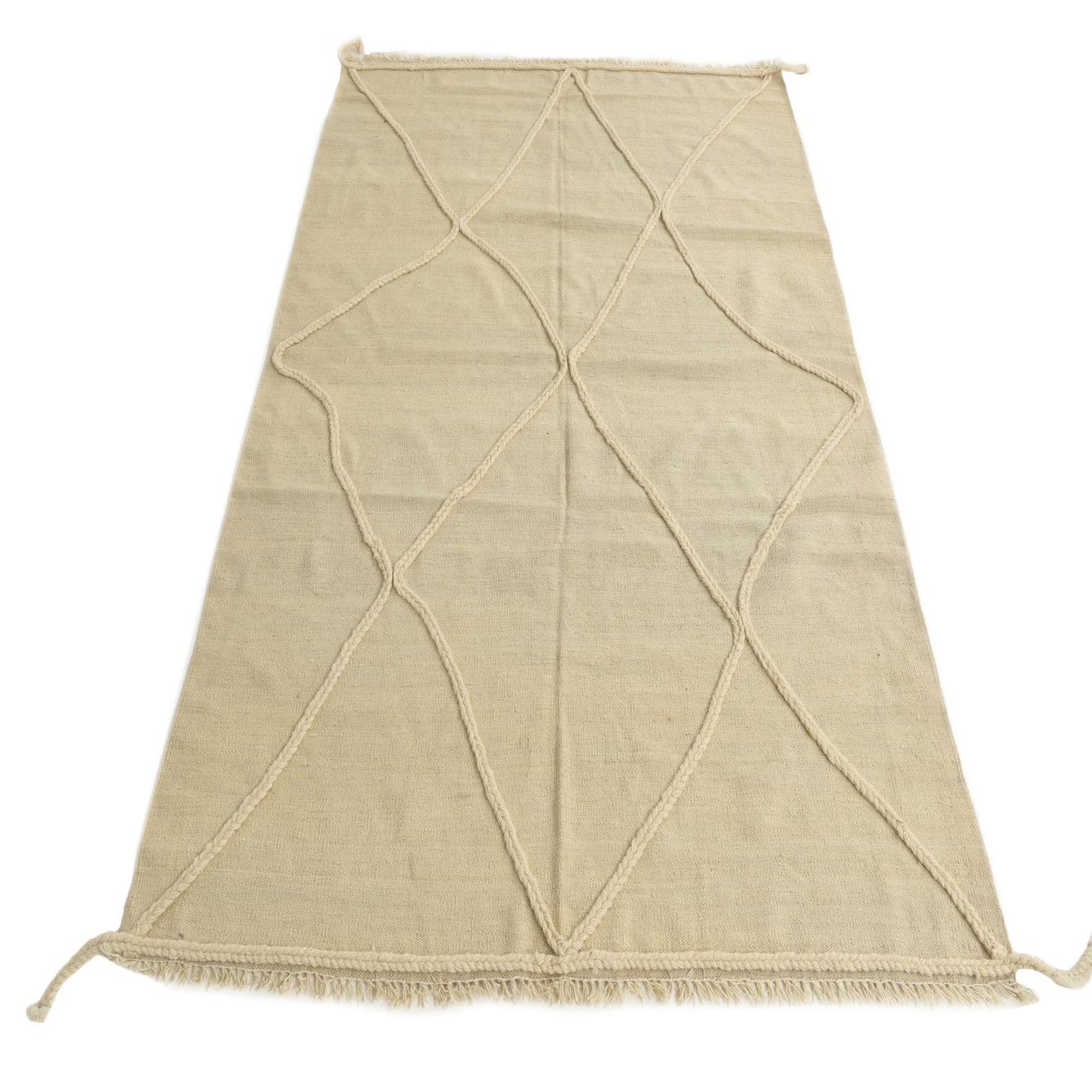 The Moroccan collection presents a handwoven 4x6 wool rug that features a simplistic yet captivating design. The cream-colored background is elegantly complemented by a series of intersecting diamond patterns, adding a subtle geometric appeal to its texture. Crafted with 100% wool, this rug offers a soft and inviting feel underfoot.