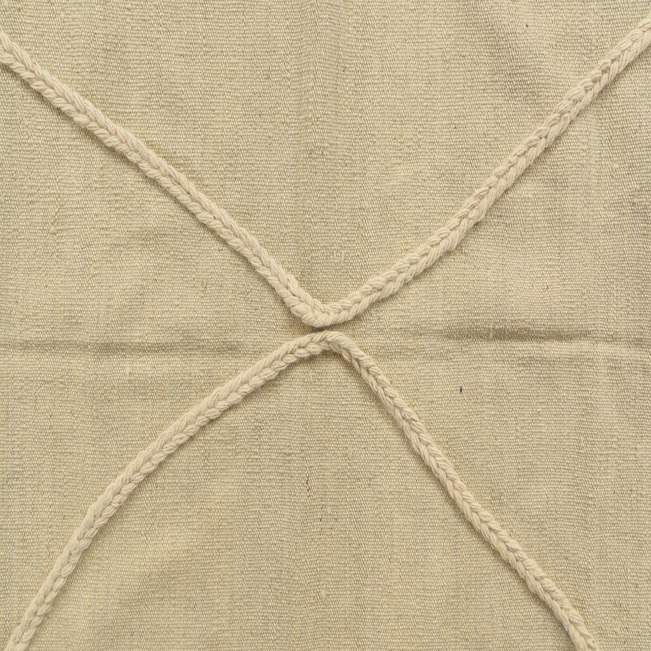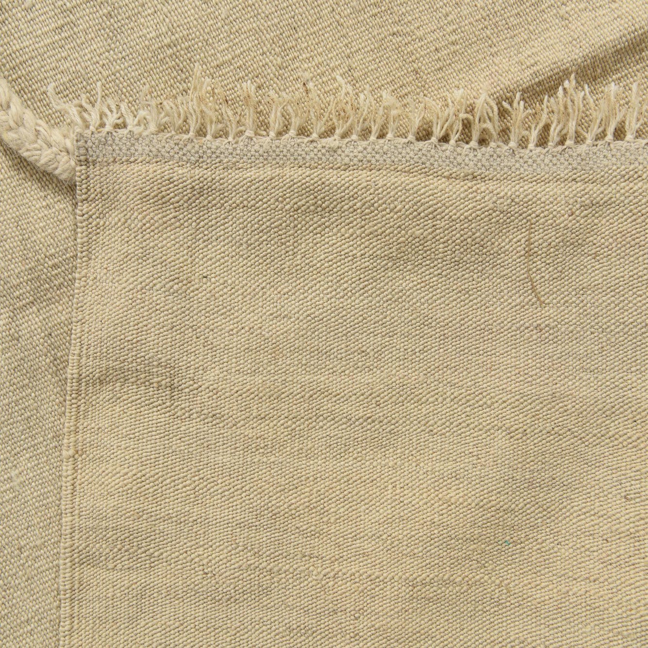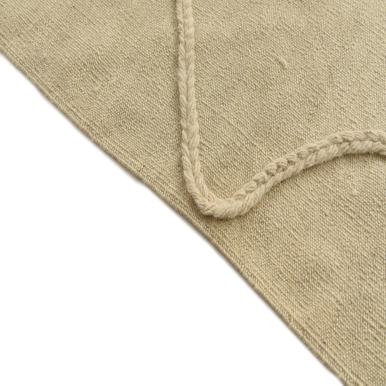 The natural hue of this piece is accented with the tactile dimension provided by the raised pattern, creating an interplay of shadow and light across its surface. Finished with a fringe on the shorter ends, the rug adds a touch of traditional craftsmanship to its aesthetic.