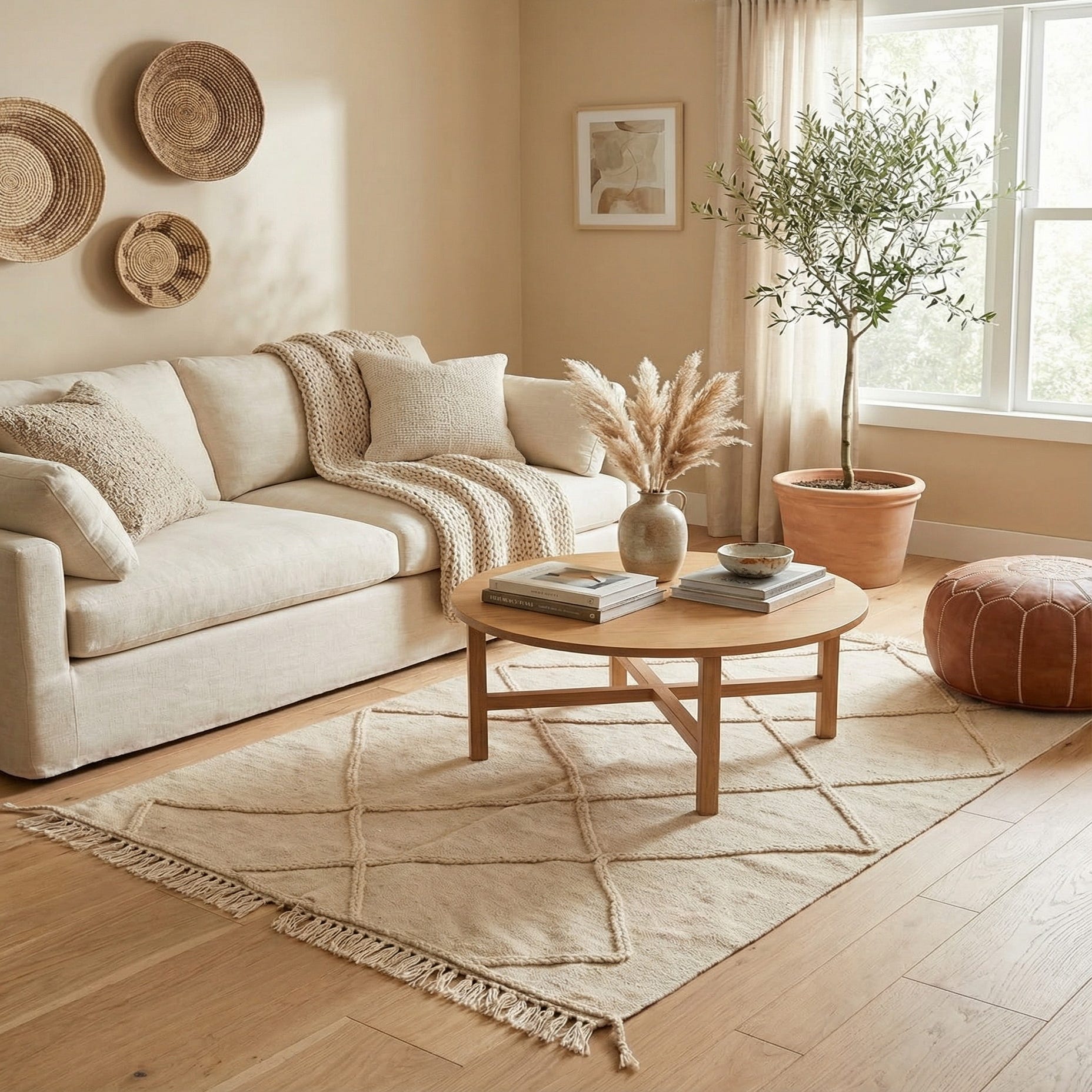 The texture and symmetry of the diamond motifs are indicative of traditional Moroccan designs, which have been reimagined to suit contemporary interiors. The fringe detailing adds an element of casual elegance, adhering to the authentic Moroccan aesthetic.