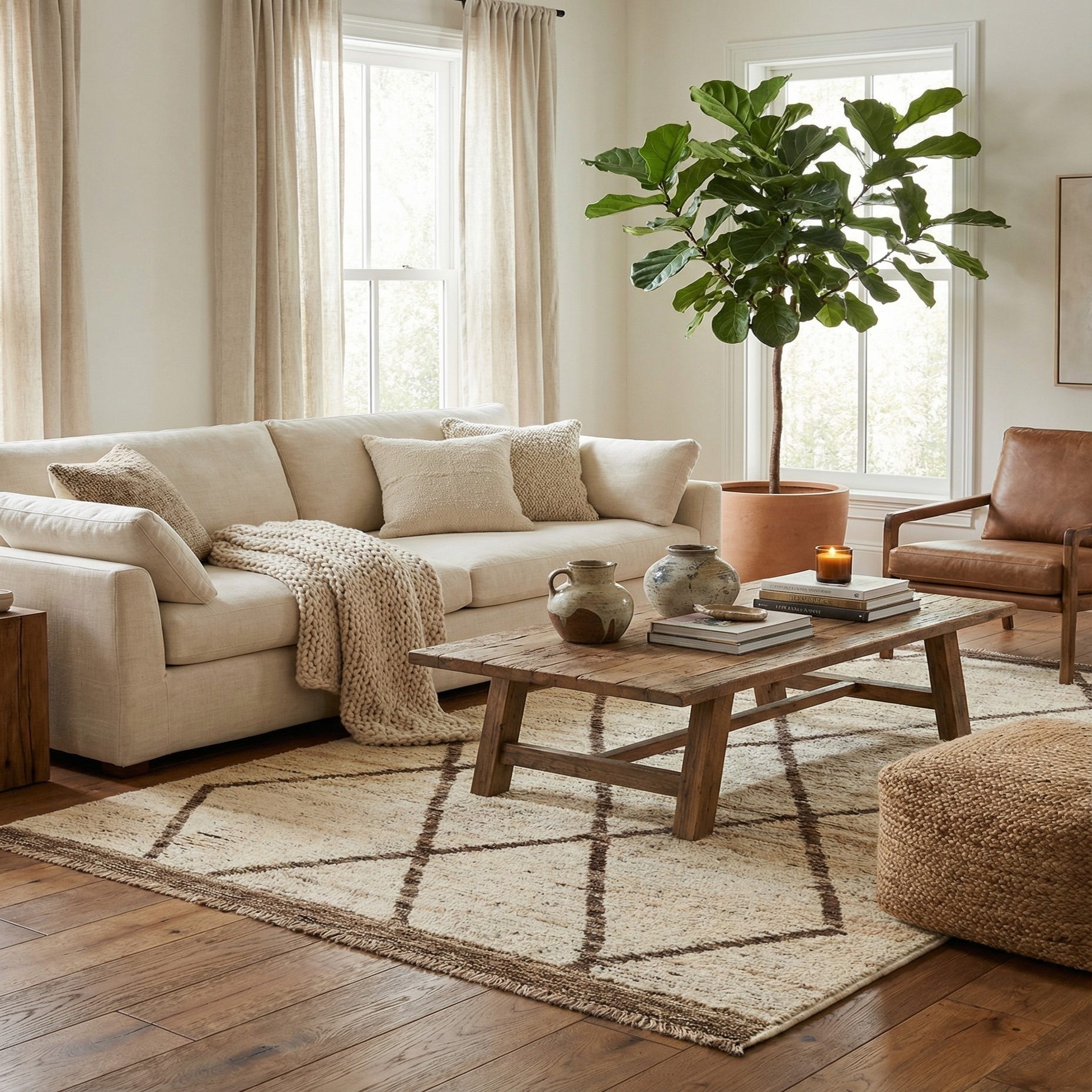 A 4x6 rectangular ivory wool rug with a tribal geometric diamond pattern in brown, suitable for a living room.