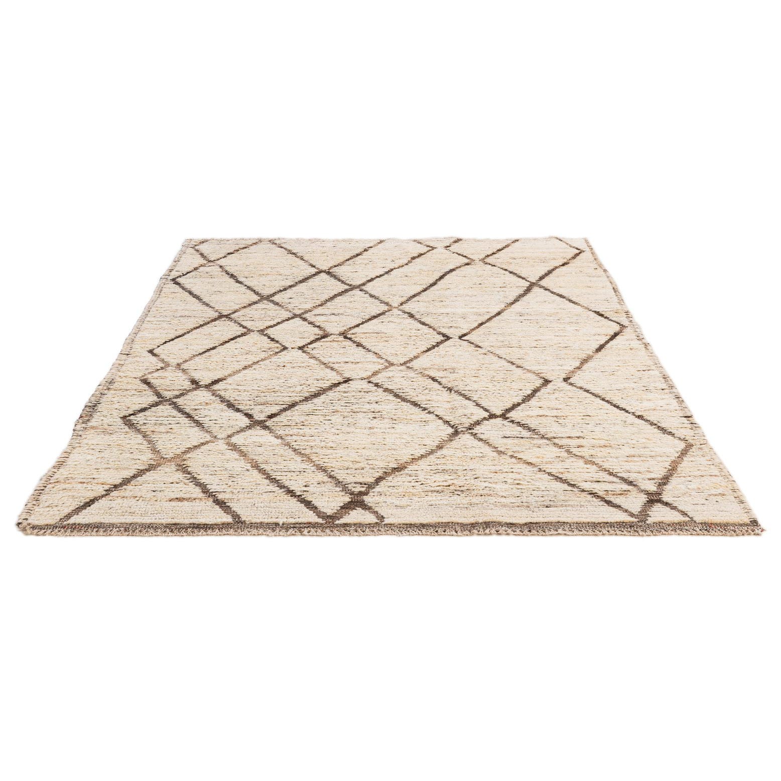 A 4x6 rectangular ivory wool rug with a tribal diamond pattern in dark brown, suitable for a living room.