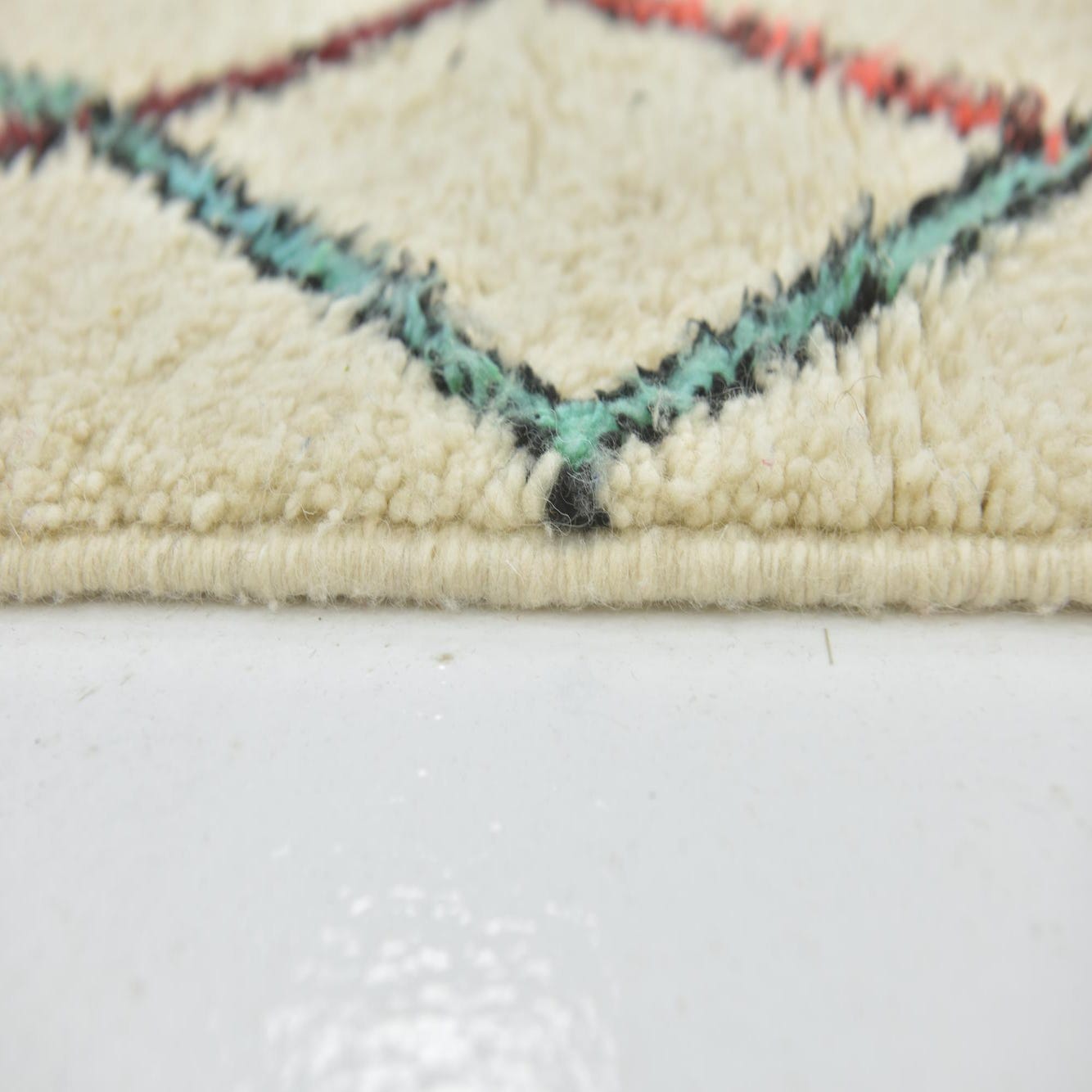 This Moroccan collection rug, measuring 4x6 feet, is hand-knotted from 100% wool and offers a blend of durability and texture. With a semi-antique age of 40-60 years, it brings both history and craftsmanship into any space. The cream background is adorned with a vibrant, geometric lattice pattern featuring intersecting lines in a palette of black, red, navy blue, blue, pink, and burgundy. The playful yet orderly arrangement of colors adds a touch of eclecticism, while the presence of fringe on the ends provides a traditional finish.