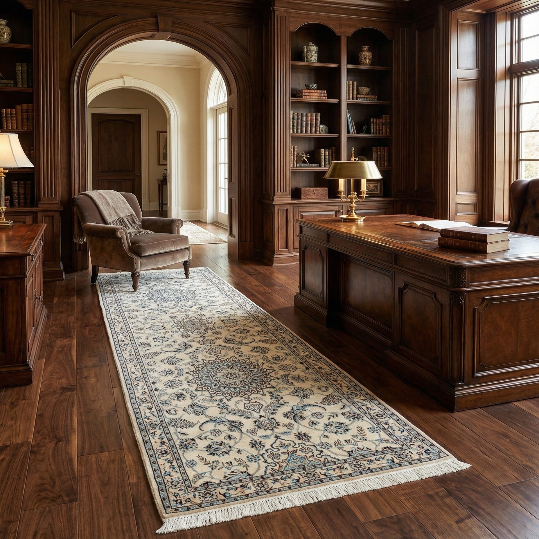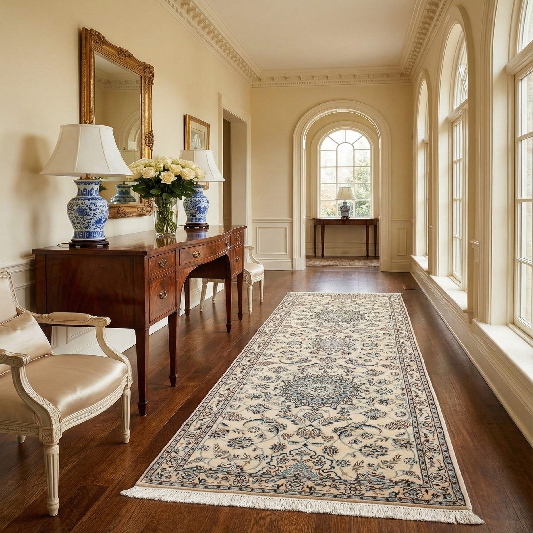 A 4x6 rectangular ivory wool rug with intricate blue and beige traditional patterns, featuring fringe on the ends.