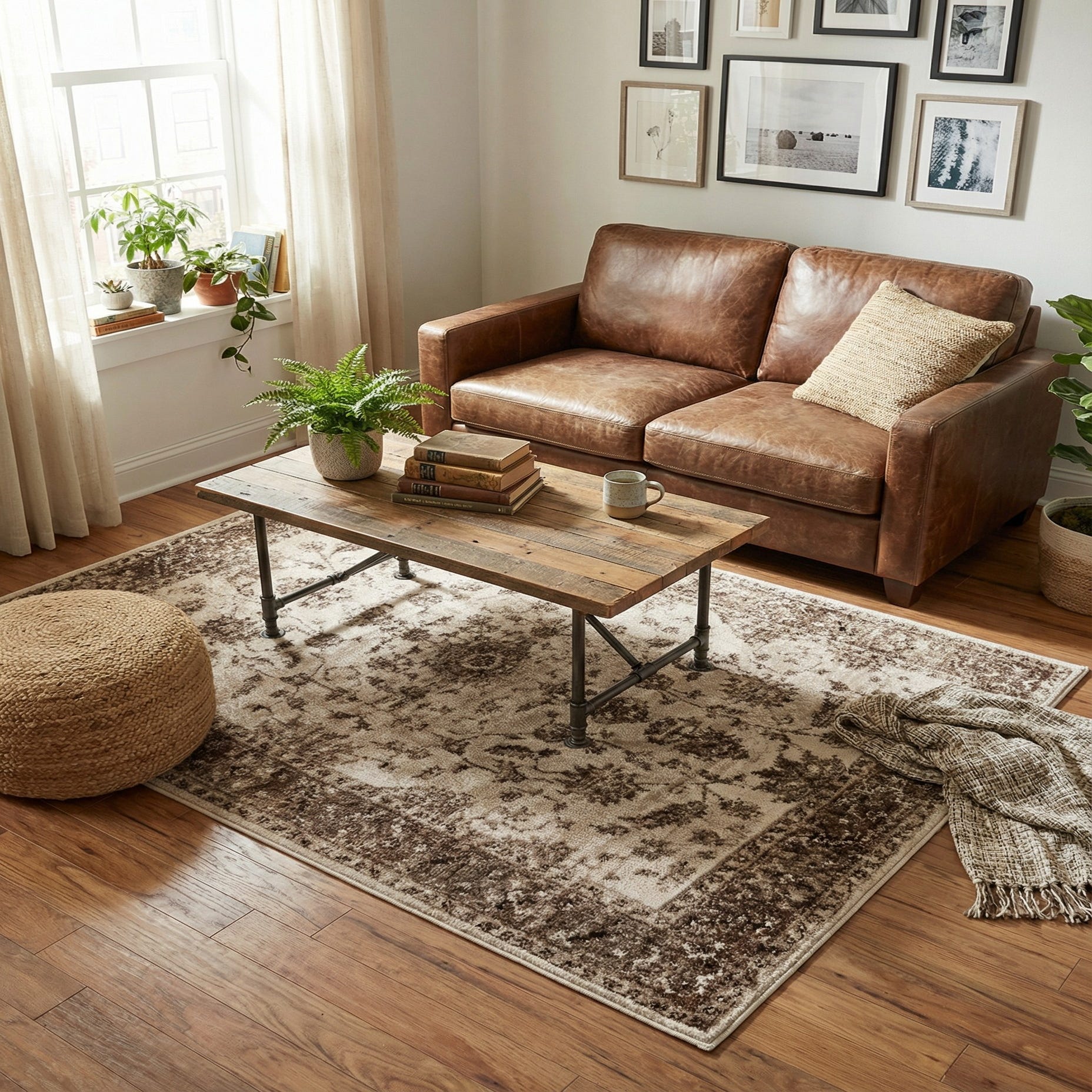 This rug works well to ground a neutral seating area, warm an entryway, or sit at the foot of a bed while adding understated pattern to the floor. It pairs nicely with warm wood tones, leather or linen upholstery, and matte metal accents, and suits transitional, modern farmhouse, or traditional interiors looking for a muted, cozy anchor. The cream background brightens the space while the brown tones provide a warm, layered feel.