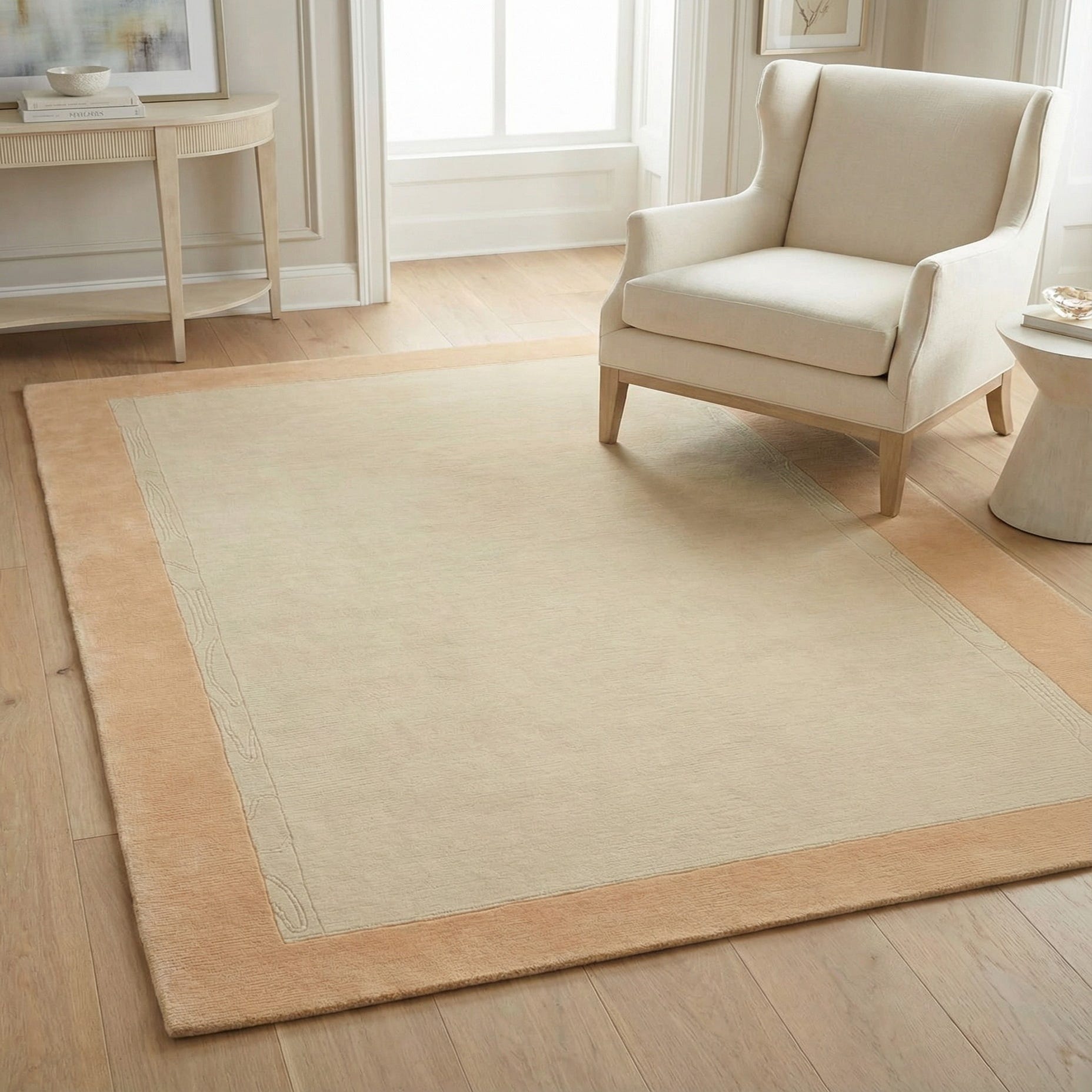 This Nepal collection rug presents a sophisticated aesthetic through its understated elegance and simplicity. The cream background is complemented by soothing peach borders, embodying a serene and welcoming palette. Hand-knotted from a blend of wool and silk, this 4x6 piece showcases a subtle sheen and a plush texture, which contributes to its luxurious feel underfoot.
