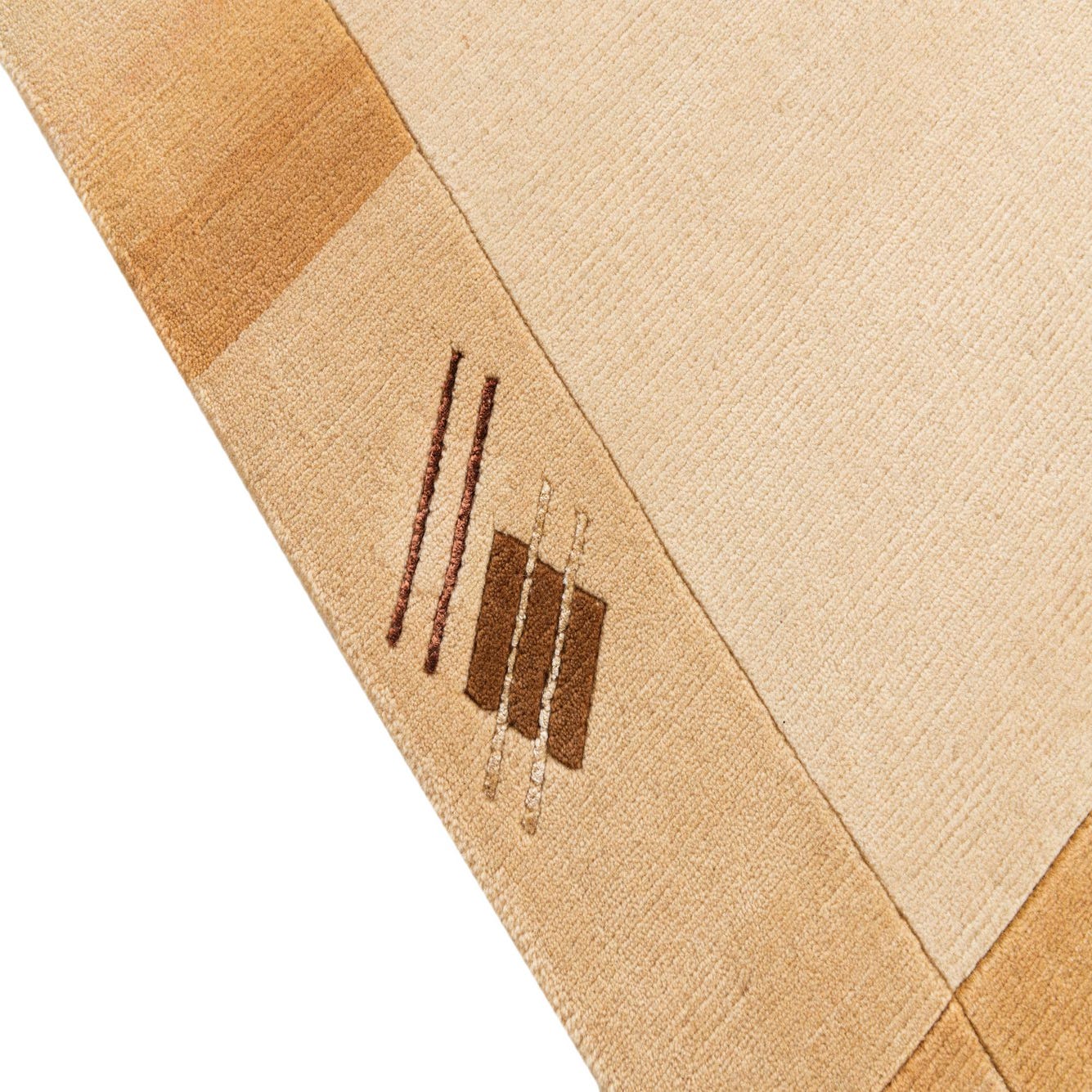 The Nepal Collection presents a refined 4x6 hand-knotted rug crafted from a luxurious blend of wool and silk. This piece features a harmonious palette of cream, beige, brown, and light brown, with the background predominantly cream. The design showcases subtle geometric patterns and contemporary linear motifs that create an elegant border along two edges of the rug. This understated design adds a sense of depth and structure without overwhelming the space it occupies.