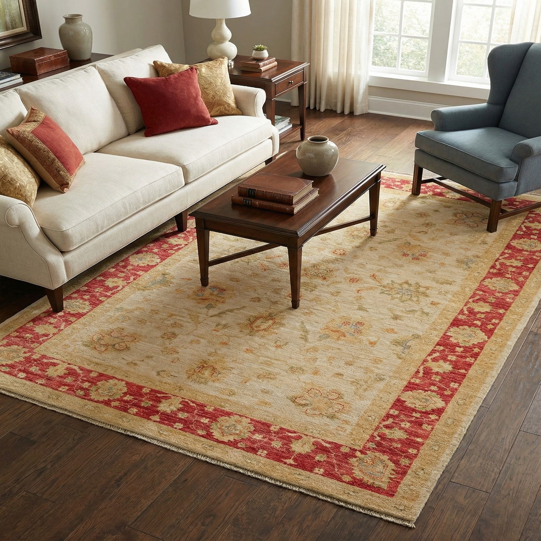 A 4x6 rectangular Peshawar Ziegler rug with an ivory field and a bold red border featuring traditional floral patterns.