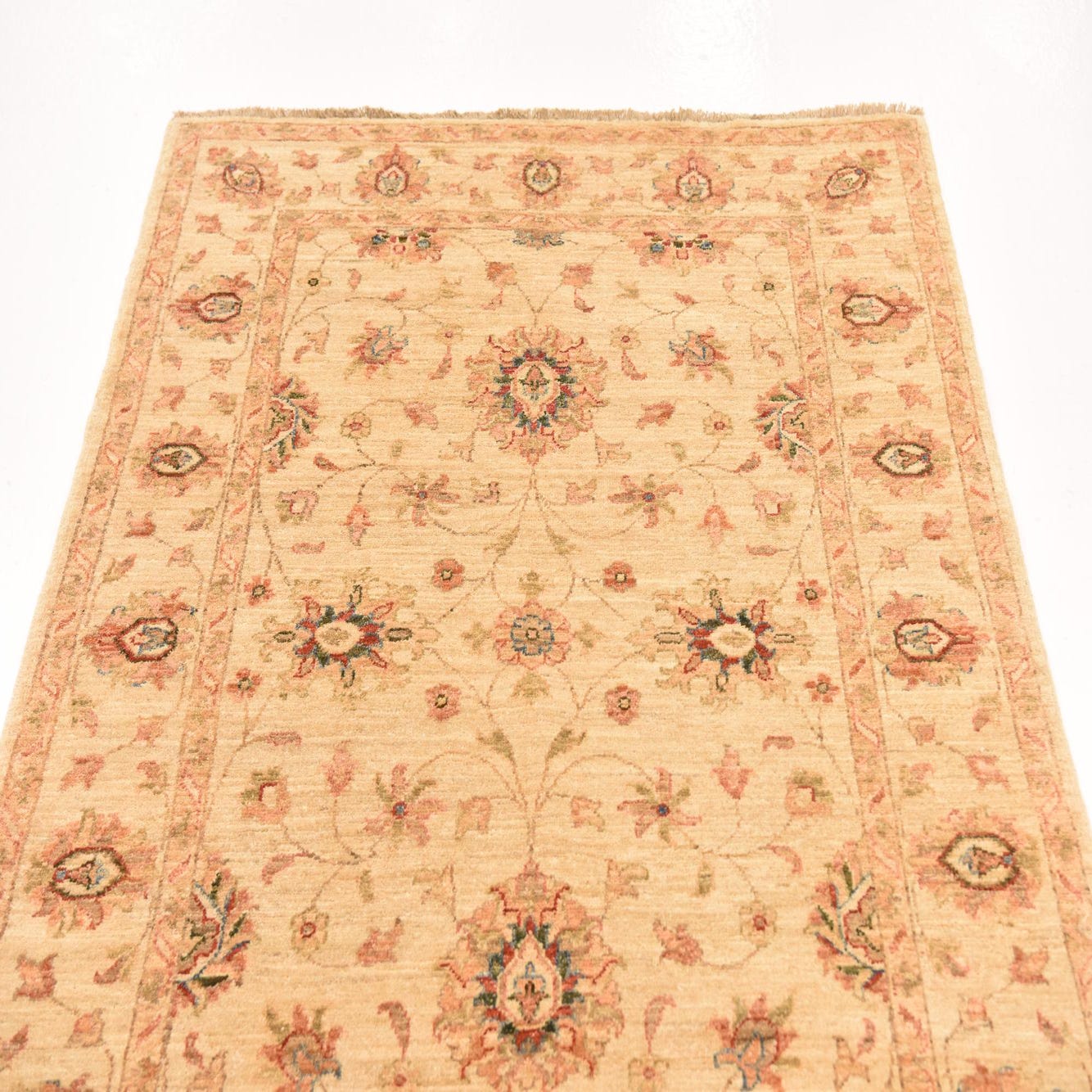 This Peshawar Ziegler rug, sized at 4x6, presents a classic design with a rich palette including Cream, Beige, Gold, Green, Red, and Peach hues, set against a Cream background. The hand-knotted construction from 100% hand-spun wool contributes to its durability and tactile appeal. The pattern features traditional motifs and floral elements that bring a timeless elegance to the piece.