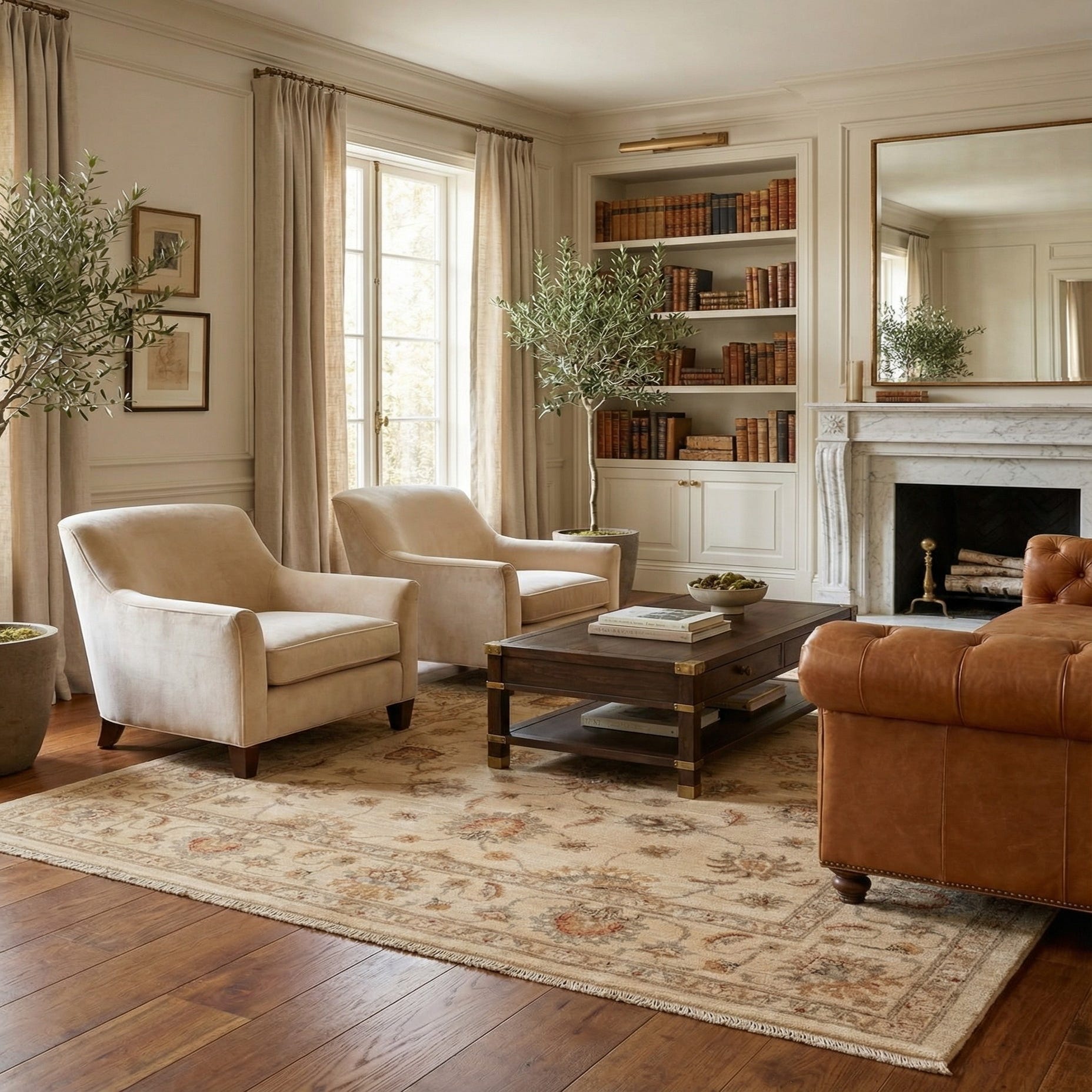 A 4x6 rectangular ivory wool rug with a traditional botanical and floral pattern, featuring muted cream and beige tones.