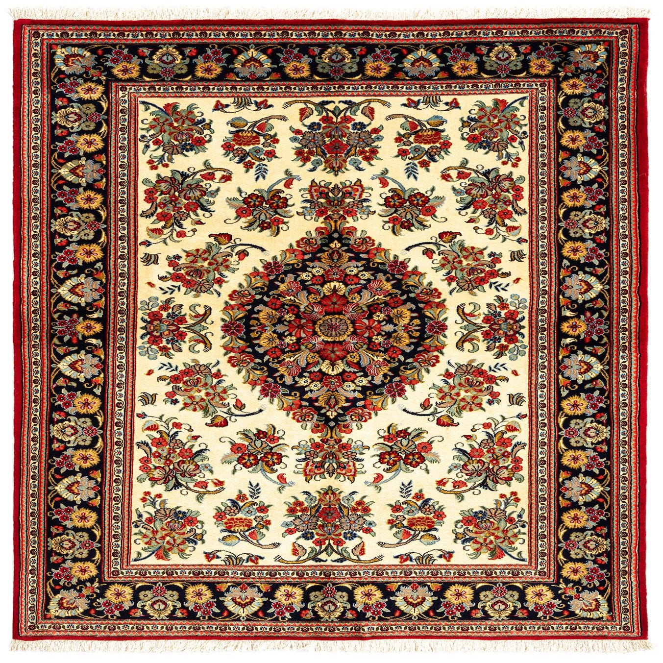 The Ghom collection offers a hand-made wool rug with a 4x6 dimension that is a true testament to craftsmanship and design. This piece features a cream background embraced by an intricate pattern with a rich blend of colors that include navy, red, slate blue, olive, and mustard, providing a harmonious balance between warmth and sophistication. The central medallion motif, bordered by an elaborate display of florals and accentuated by a navy border, anchors the design and invites a sense of tradition and elegance into any space.
