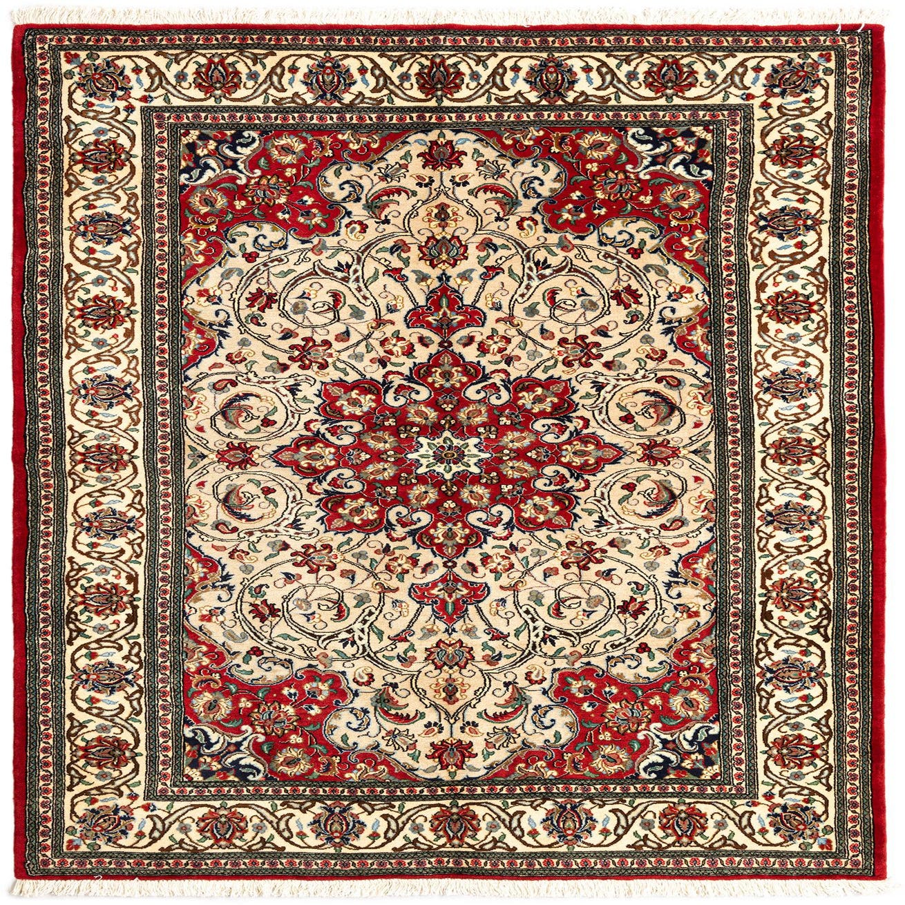 A 4x6 rectangular Qom Persian rug in ivory and red, featuring an intricate floral medallion pattern and decorative border.