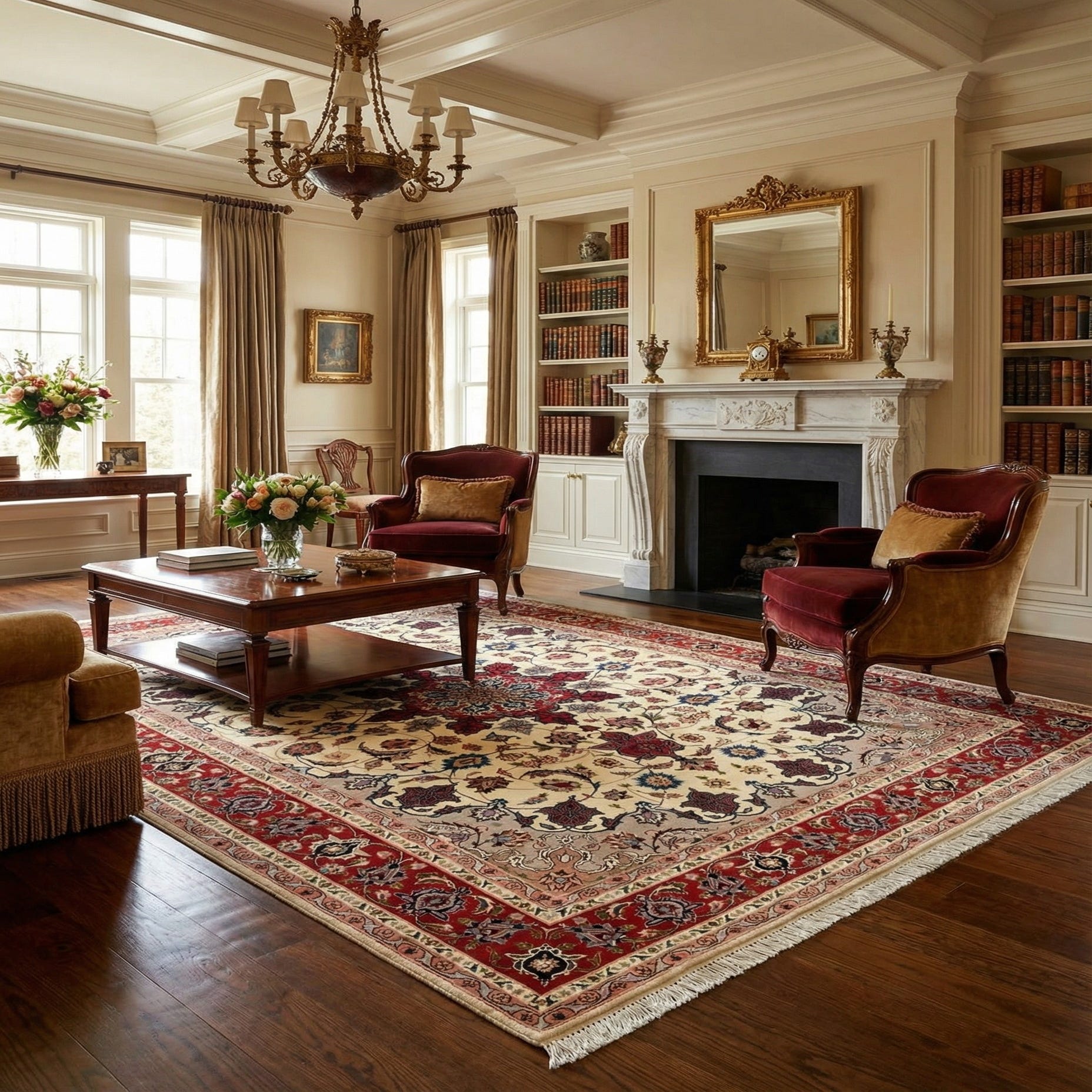 This rug is ideally suited for spaces that celebrate classic style and craftsmanship. It would be equally at home in a formal living room, a sophisticated study, or a grand entryway, providing a focal point that is both artistic and tasteful. The balance of color in this rug allows it to complement a range of interior design scenarios, from monochromatic and muted spaces where it would add a touch of warmth and color, to more eclectic settings where it would contribute to a layered, textured look.
