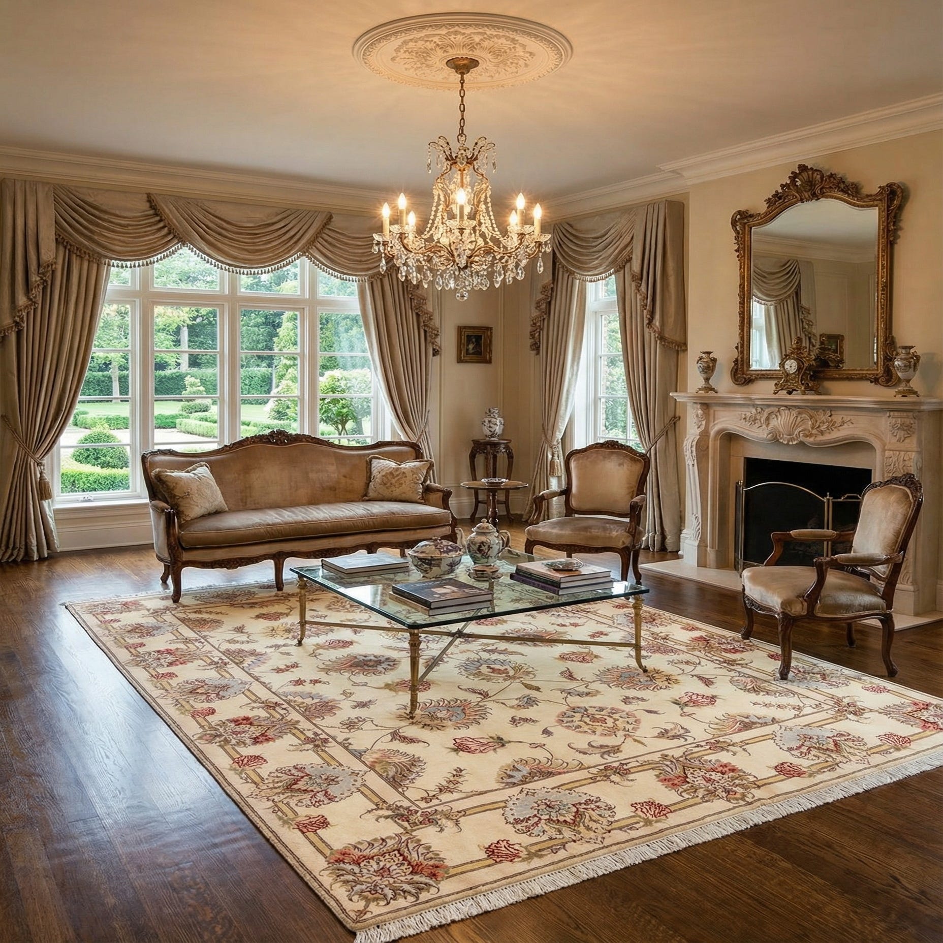 A 4x6 rectangular ivory Persian rug with an intricate floral and medallion pattern in cream, red, and blue tones, featuring a medium pile.