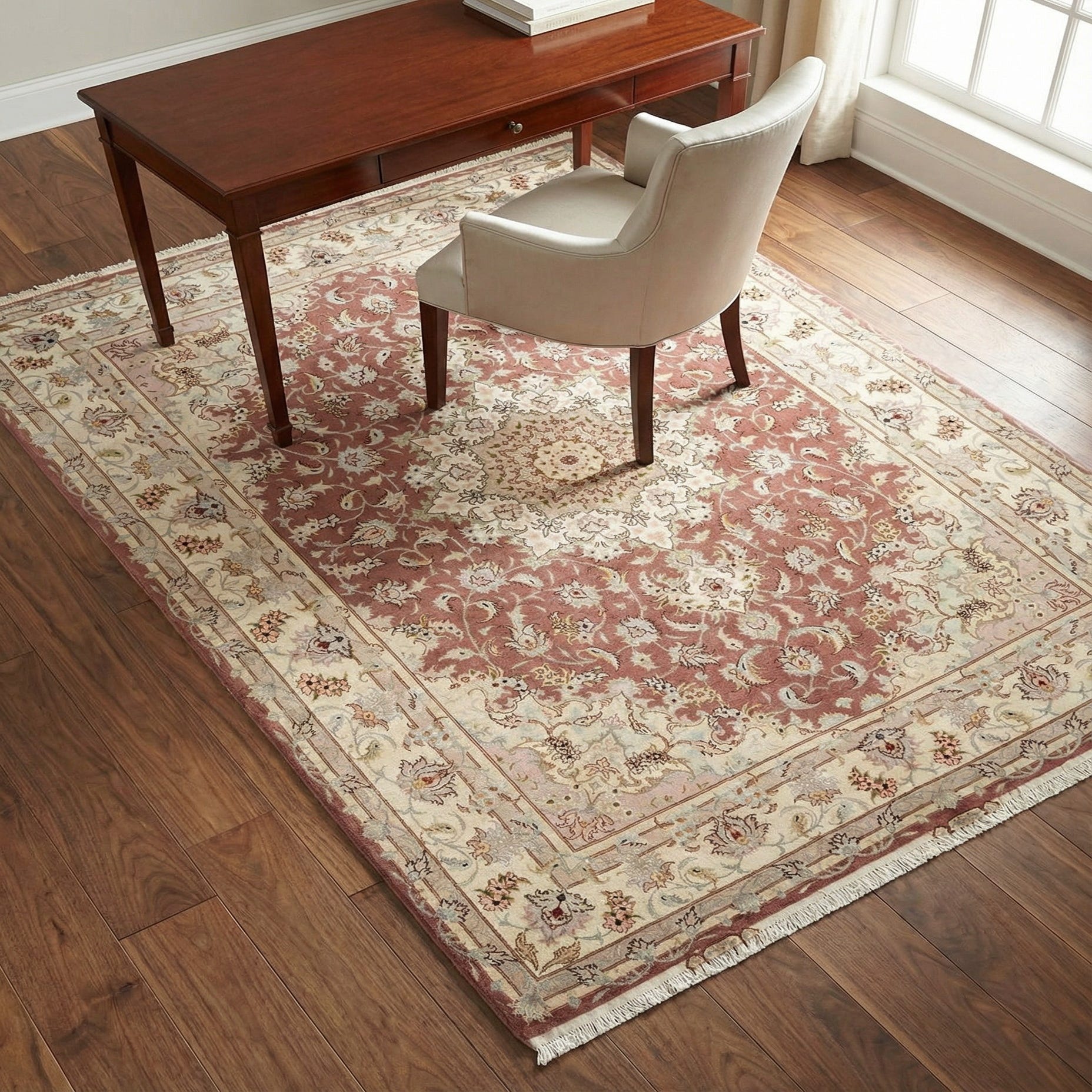 The Tabriz collection offers a 4x6 handmade rug that features a harmonious blend of wool and silk, culminating in a piece with a luxuriously soft texture and a subtle sheen. This rug showcases an intricate pattern rooted in traditional design, with a central medallion anchored by floral and vine motifs that extend gracefully across the cream background. The color palette is a sophisticated mix that includes cream, pink, purple, olive, blue, and beige, providing a versatile yet nuanced aesthetic.