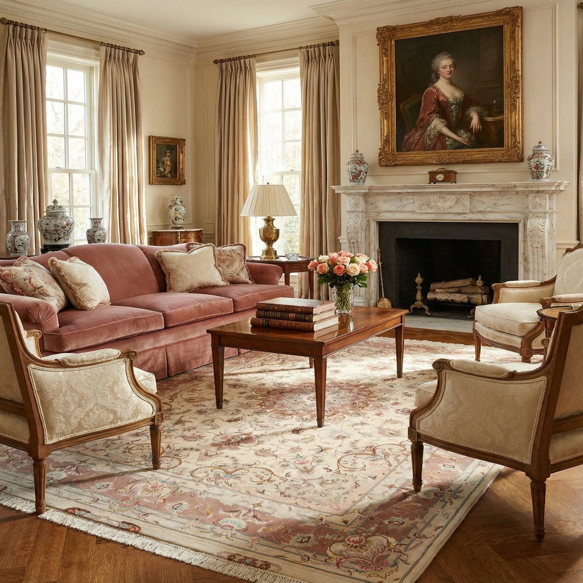 A 4x6 rectangular ivory Persian rug with a detailed floral medallion and a wide rose-colored border.
